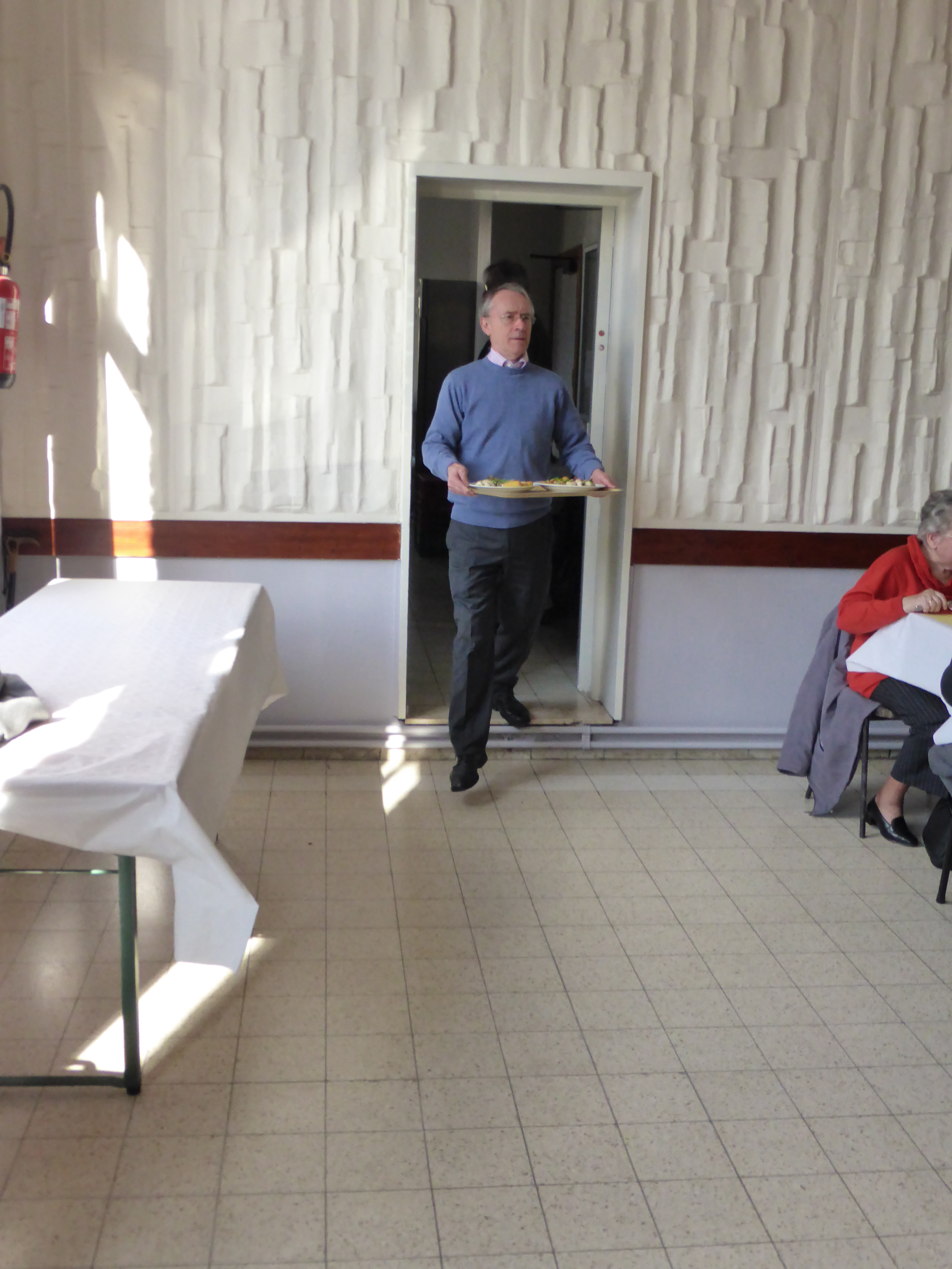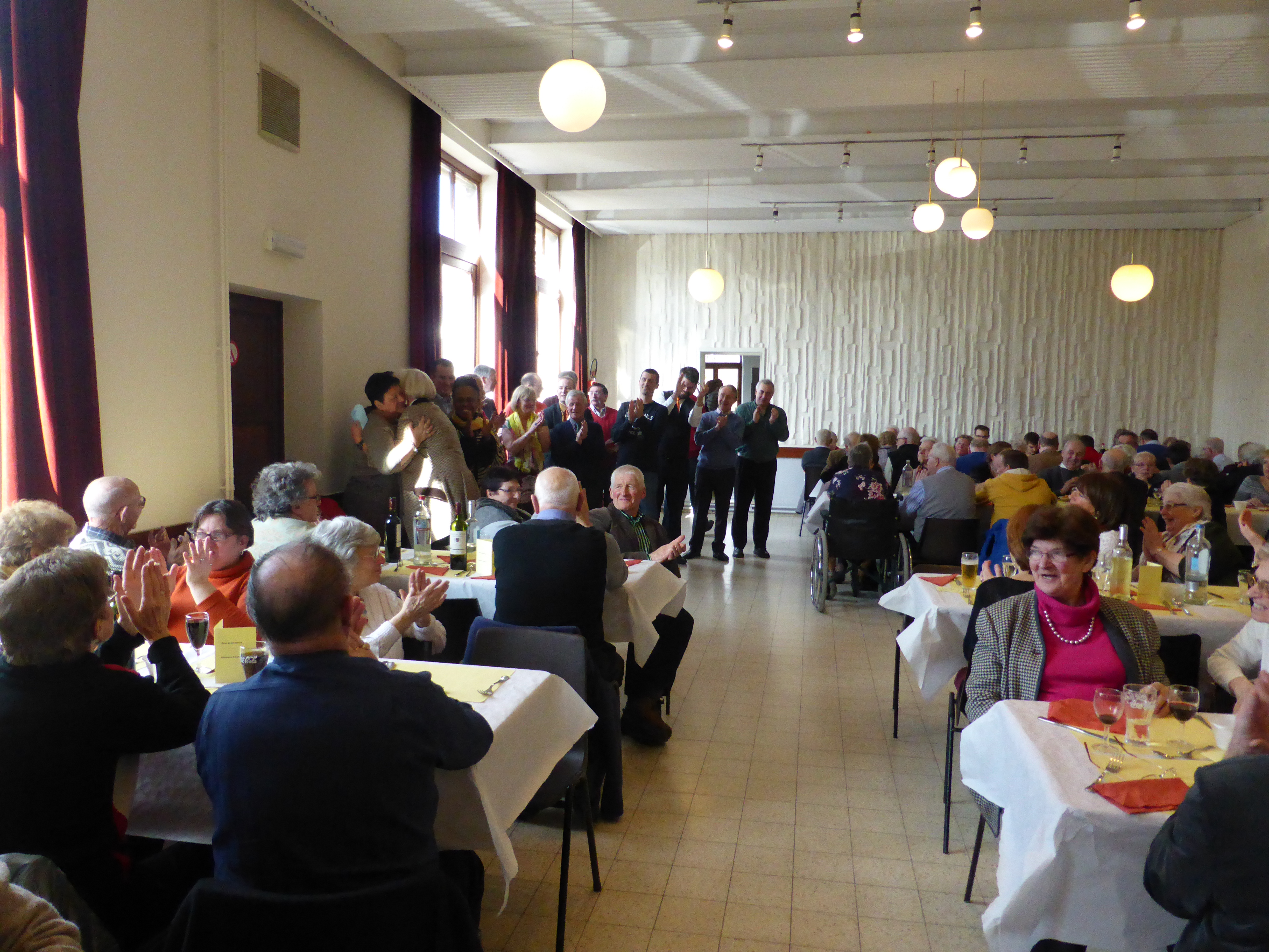 Les membres du comité ont tous retroussé leurs manches pour servir un apéritif, un délicieux velouté de carottes, en plat principal un filet de dinde, comme dessert une succulente nougatine et pour terminer un café. 200 convives à servir le plus rapidement possible et en même temps, c’est du boulot… mais nous l’avons fait avec beaucoup d’entrain (voir photos de gauche à droite entre autres Claude Kalbusch (président de la section), Jean-Luc Lecluse, Raymond Evrard (échevin), Bruno Van de Casteele et Albert Wiaux en pleine action). Un grand merci à l’équipe de la cuisine pour cet excellent repas.
