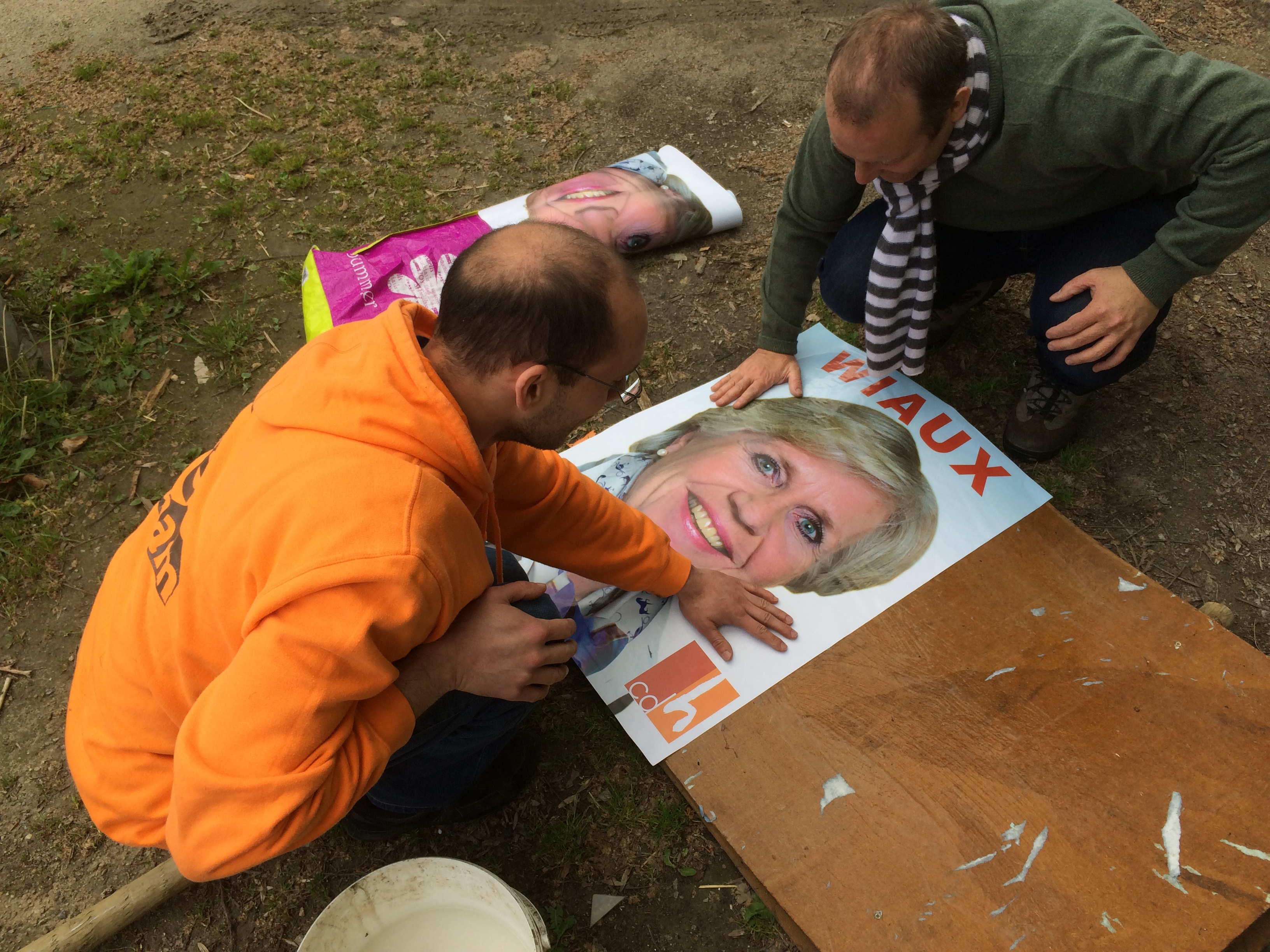 Ici nous sommes en train de coller des affiches sur des panneaux qu’on installe chez des particuliers.