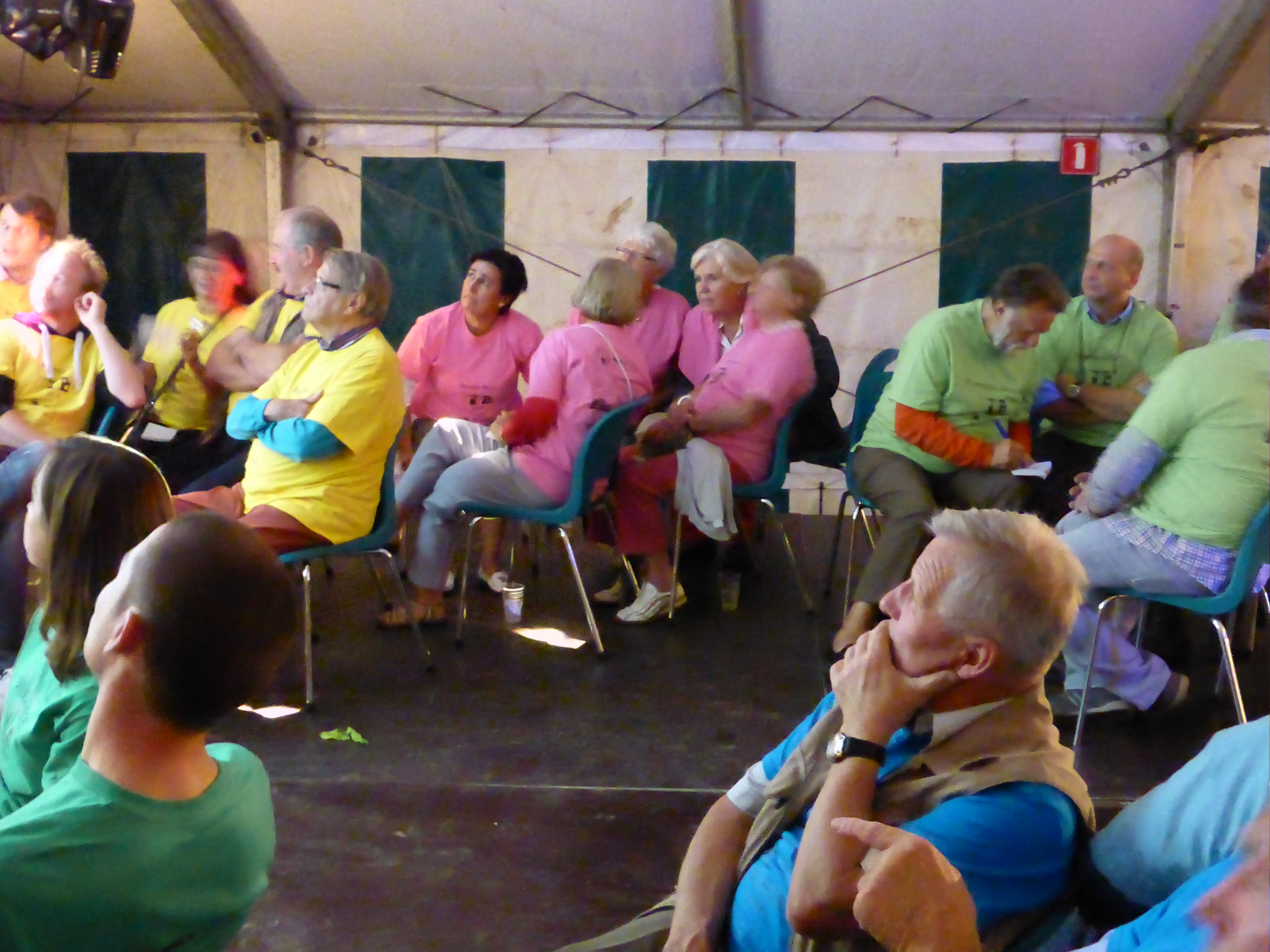 Vers 18.30 heures on pouvait savourer une excellente assiette de porchetta. Après avoir mangé, pas question de se relâcher, car c’était le temps des spectacles sur le thème des « Grands Mystères ». Les différents villages les ont développés de différentes manières. Nodebais donnait une explication alternative aux différentes théories de complot et le Yeti dans un film très professionnel et de qualité. Hamme-Mille racontait l’histoire humoristique de son rond-point qui n’est toujours pas construit. Beauvechain faisait un medley bien apprécié autour de différents thèmes de science-fiction. L’Ecluse évoquait les sorcières malheureuses de Salem (Etats-Unis) avec une danse très inspirée. Tourinnes-la-Grosse parlait de la parenté d’une certaine Delphine dans un sketch qui nous a bien fait rire. La Bruyère (équipe gagnante de cette partie) a terminé avec une danse druidique avec de nombreuses personnes et un décor très élaboré.