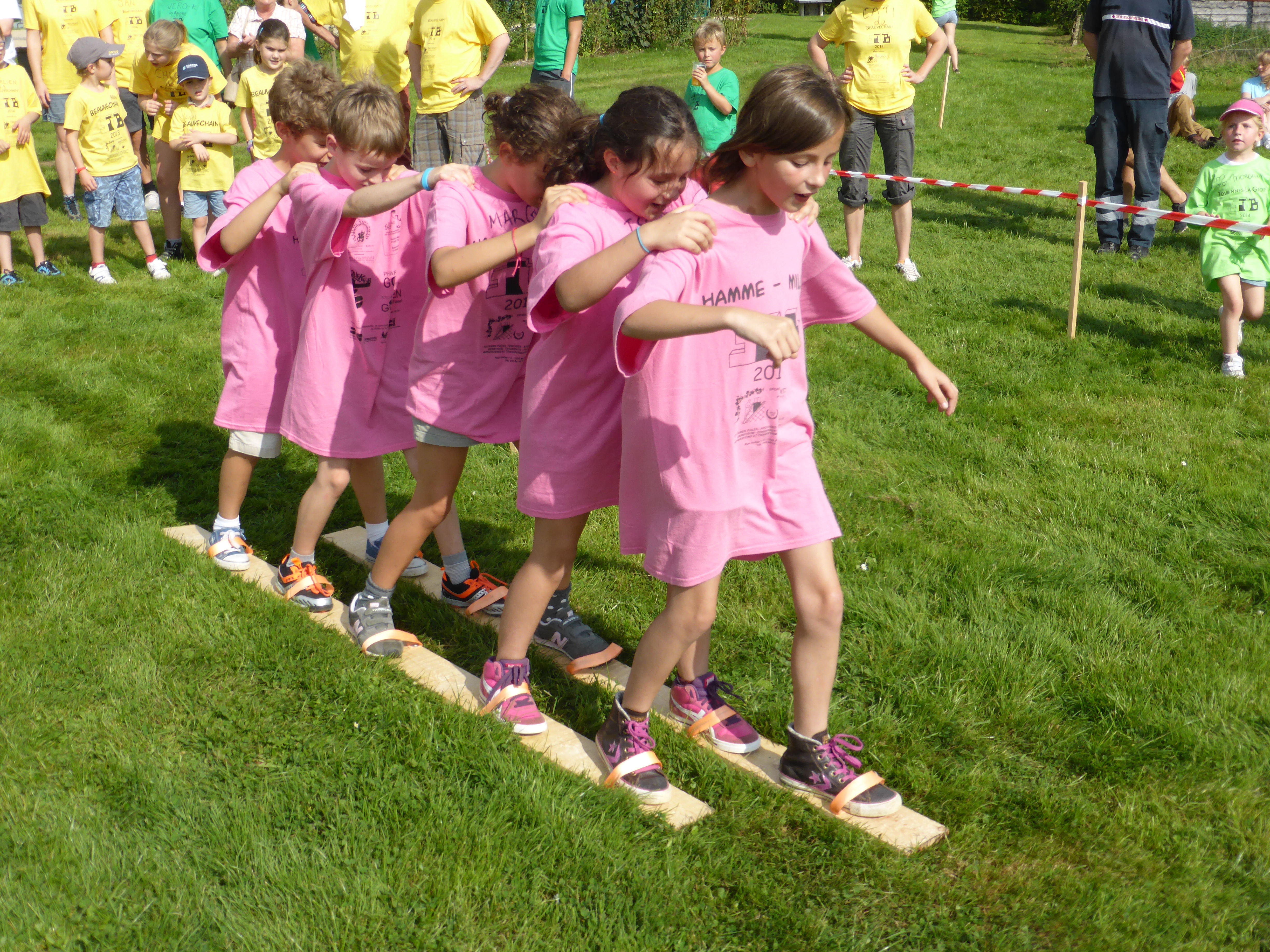 Il y avait aussi une course « ski » (cinq personnes devaient marcher le plus vite possible avec deux planches attachées aux pieds). Des équipes enfants ont réussi à battre plusieurs équipes adultes ! C’était vraiment une chouette idée de laisser des équipes enfants s’affronter également… idée à retenir pour l’année prochaine (la patience et la ténacité des enfants doivent servir d’exemple aux adultes). La mythique course « piscine » où l’on a vu des enfants plus petits ayant peu de chance de battre les adolescents ou les adultes, s’y sont mis avec un courage exemplaire et sans crainte de se mouiller !!!
