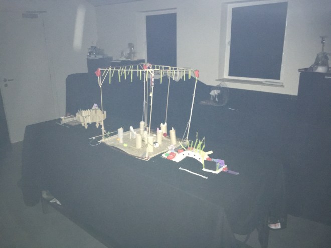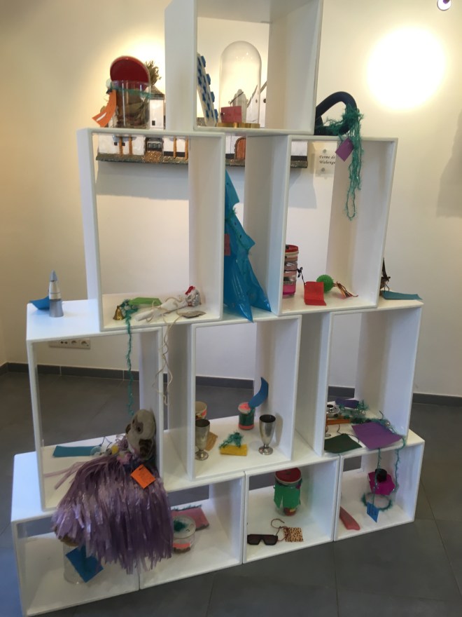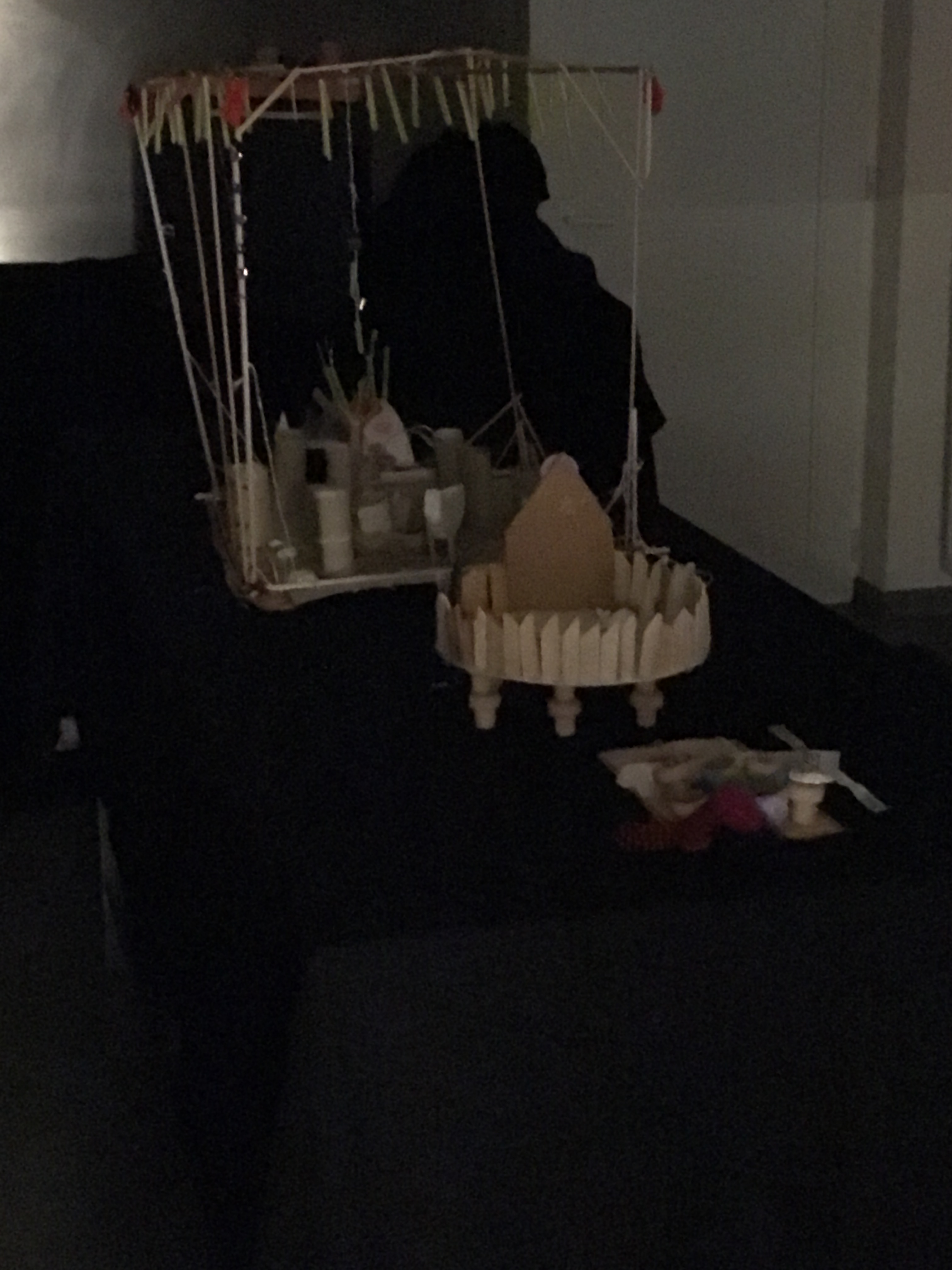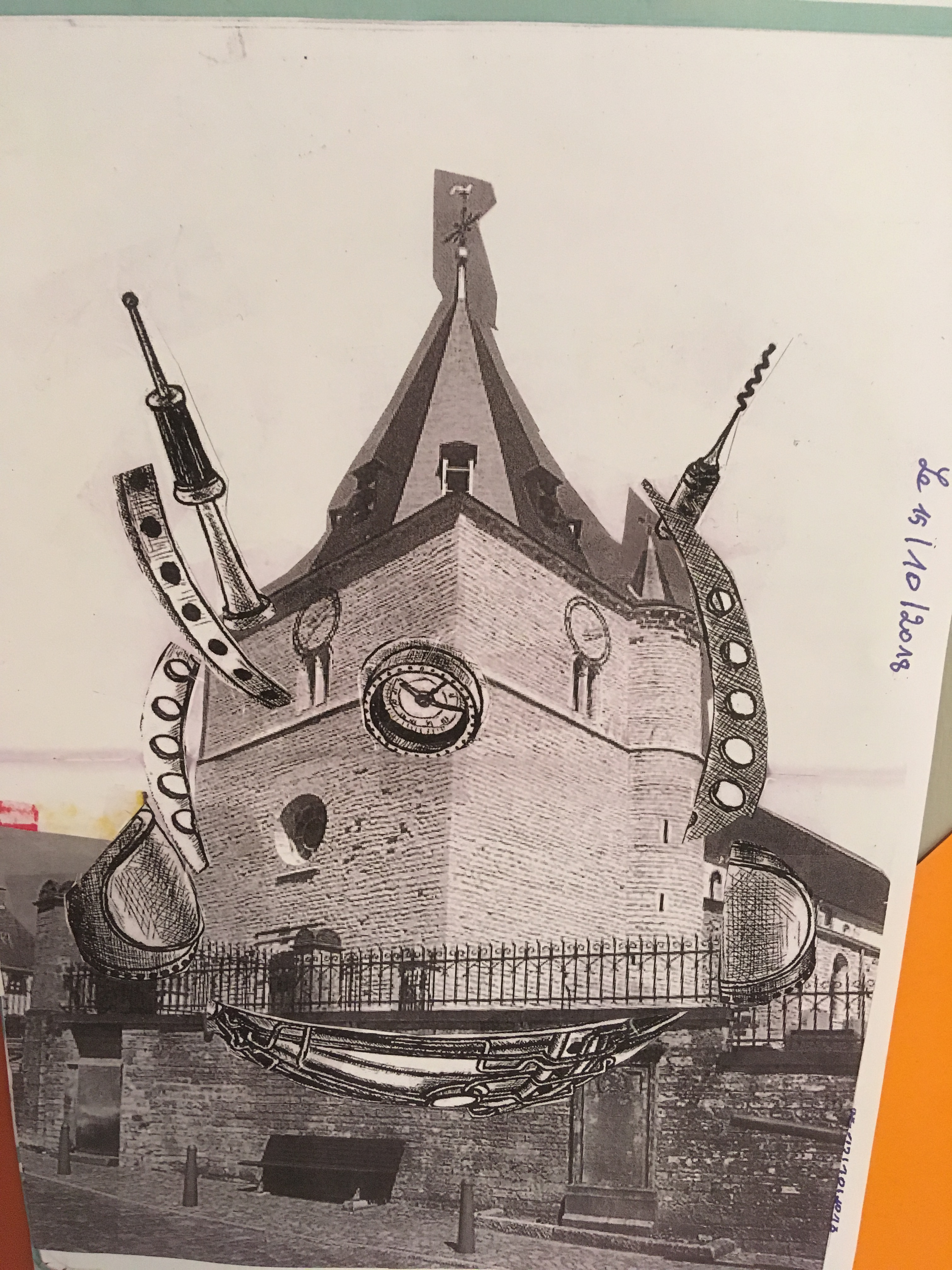 Chaque thème était travaillé avec les élèves, en faisant réfléchir et rêver les enfants. Par exemple, sur le pilori l’élève pouvait s’imaginer un personnage « pilori », ce qu’il aimait ou pas. Autre variation sur le même temps était le « temps du pilori », avec des différents « humeurs » selon l’heure. Le tout est présenté comme dessin, visualisé en argile ou sous d’autres formes. Par exemple, des maquettes inspirées par la glacière étaient présenté dans la cuisine du Vert Galant, obscuré pour l’occasion pour refléter les circonstances de la glacière.