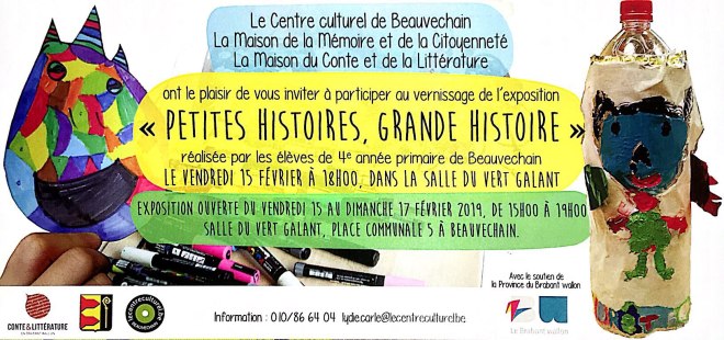 Cette démarche de la commune (Maison de la Citoyenneté et de la Mémoire) était aussi soutenue par le Centre Culture de Beauvechain et La Maison du Conte et de la Littérature et aussi la province. J’en suis convaincu que cette façon de « apprendre » sur notre patrimoine restera beaucoup plus longtemps dans l’esprit de ces élèves qu’un cours classique… espérons même qu’ils deviendront tous des défenseurs de notre patrimoine plus tard. En tout cas, l’exposition dans le Vert Galant ce weekend (15-17 février 2019) valait la peine !