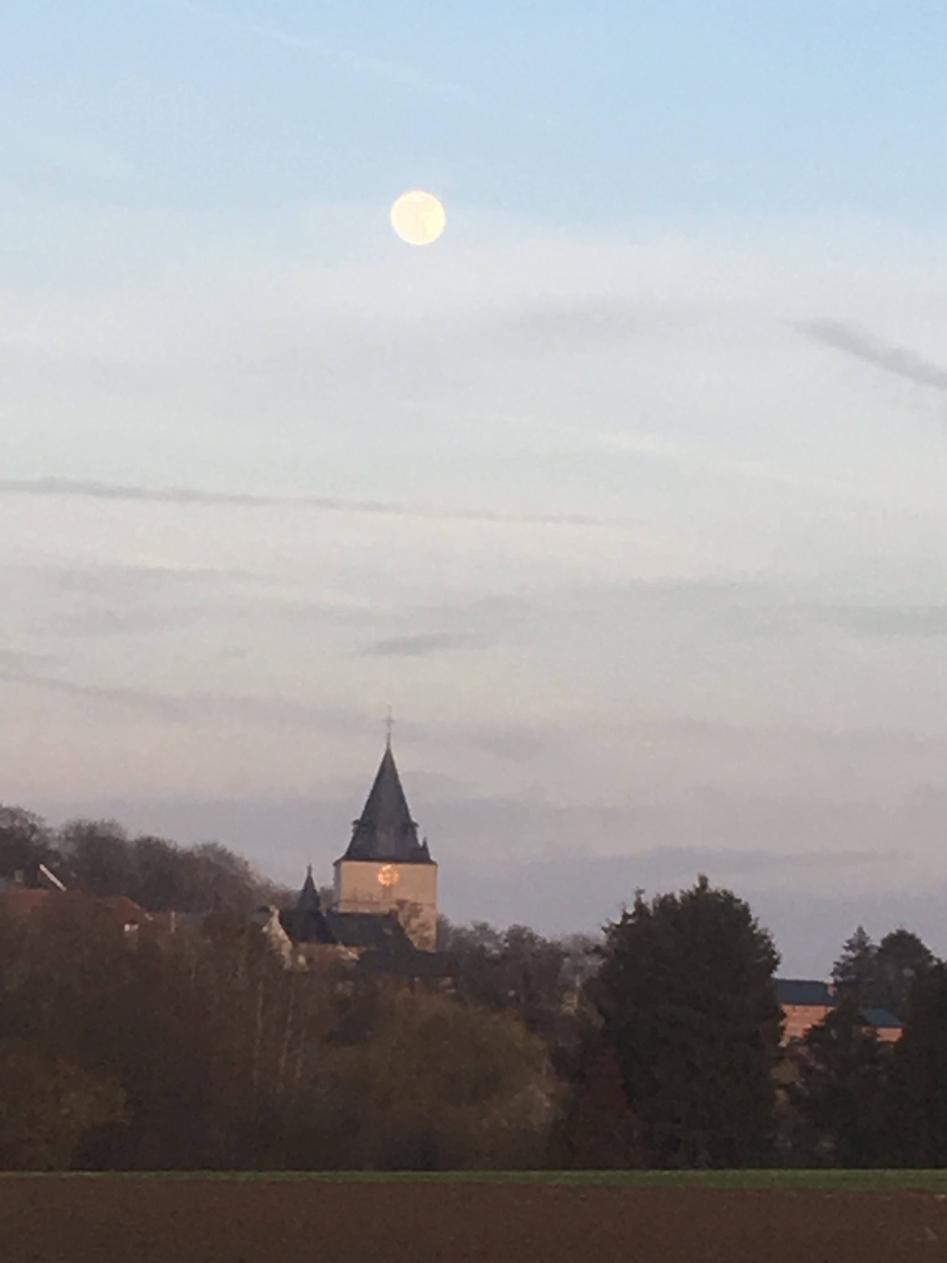 … à vélo, en route vers la maison communale… une superbe composition de la Lune avec l’église de Tourinnes. Et une composition que les automobilistes ne verront jamais! #velo
