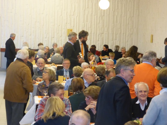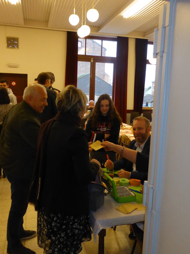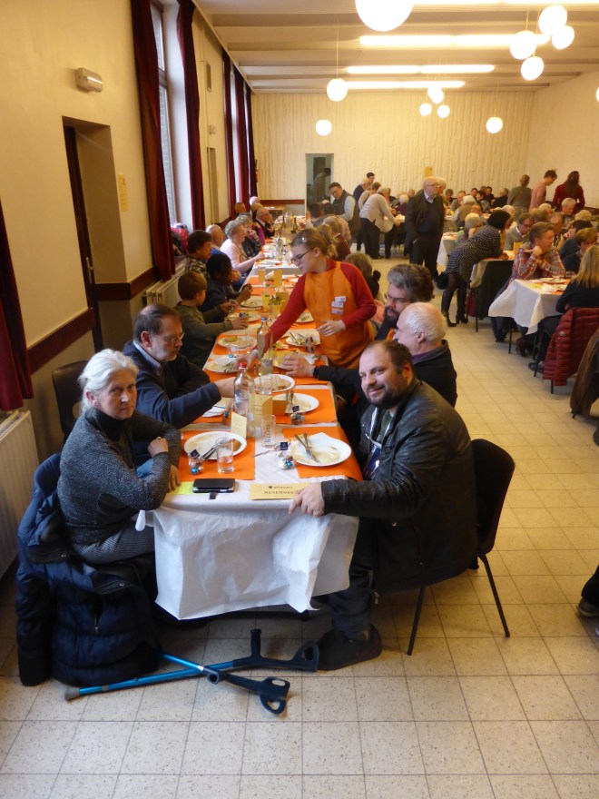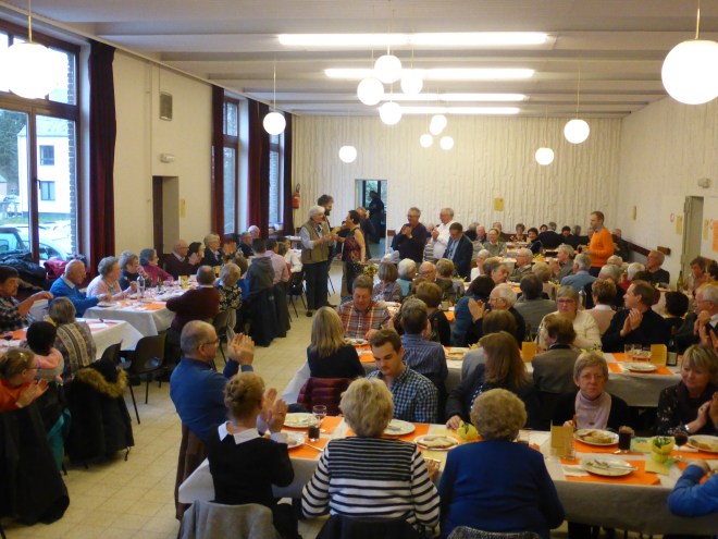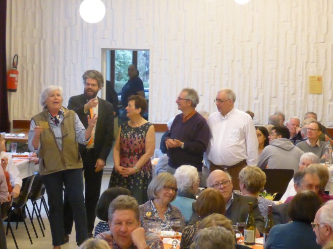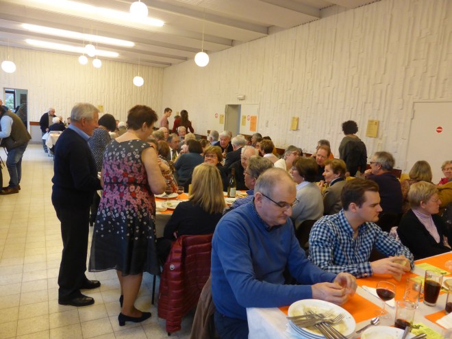 Normalement ce diner est toujours gâté par le premier soleil printanière … pas de chance cette année, il pleuvait. Disons que c’est pour le bonheur des agriculteurs et de la nappe phréatique, et pas de souci car on était à l’intérieur, entre amis et voisins.