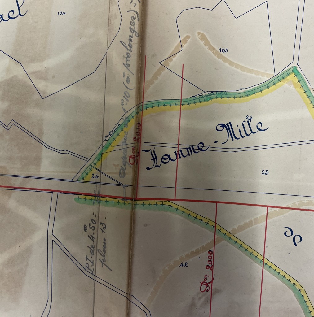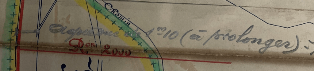 « Aqueduc de 1m10 [largeur] (à prolonger) ». Et oui, non seulement la carte montre le tracé du ruisseau, mais cette inscription de l’ingénieur prouve qu’il y avait un aqueduc et qu’il devait être prolongé !