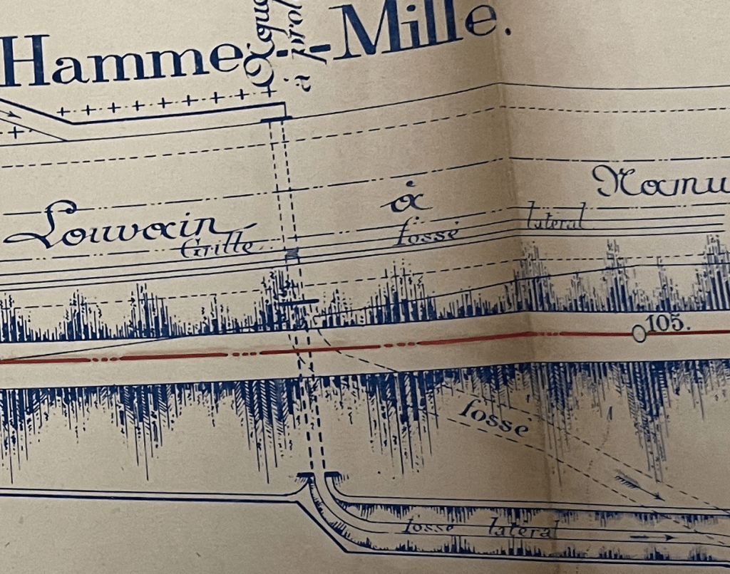 Voici une carte préparatoire de 1890 de cet endroit. Nous sommes donc dans la descente venant d’Hamme-Mille sur le territoire de l’ancienne commune d’Hamme-Mille. Le Nord se trouve à gauche sur cette carte. Le tracé à construire du tram est en rouge (actuellement, ce tracé est une piste cyclable).