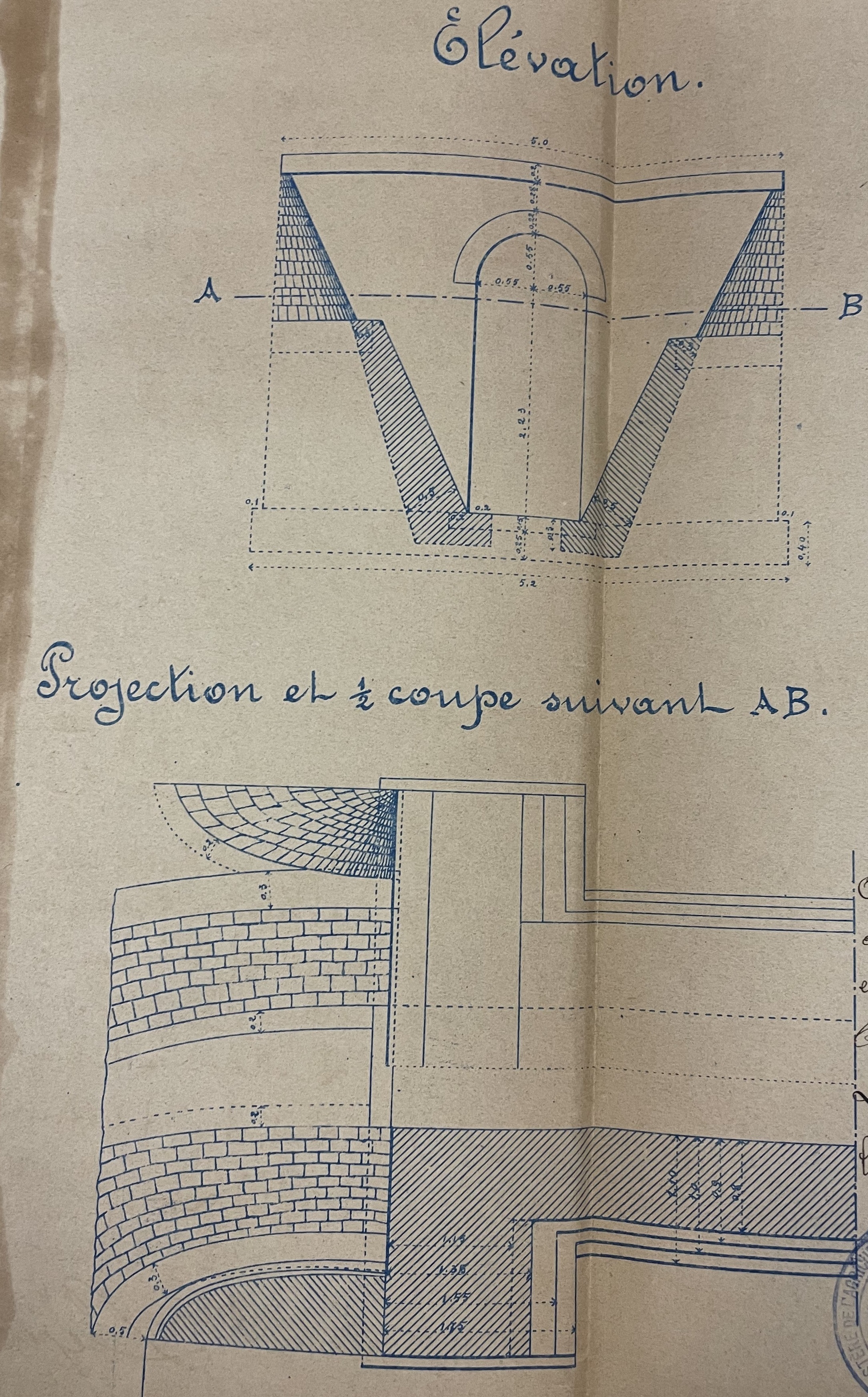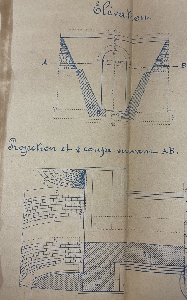 Dans un autre plan détaillé de 1891 (plans définitifs approuvés par le ministre), il y a même un détail sur la manière dont l’entrée et la sortie devaient être (re)construites. Le niveau de minutie dans ces plans est vraiment remarquable… la construction de ce tramway n’était pas une affaire menée à la hâte. Même si le temps (plus de 130 ans !) a fortement dégradé le site, on peut toujours reconnaître sur la photo ci-dessus cet emplacement.
