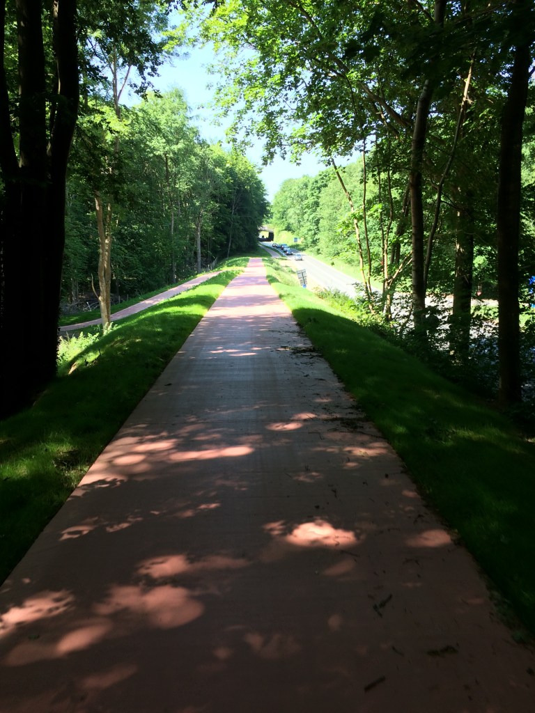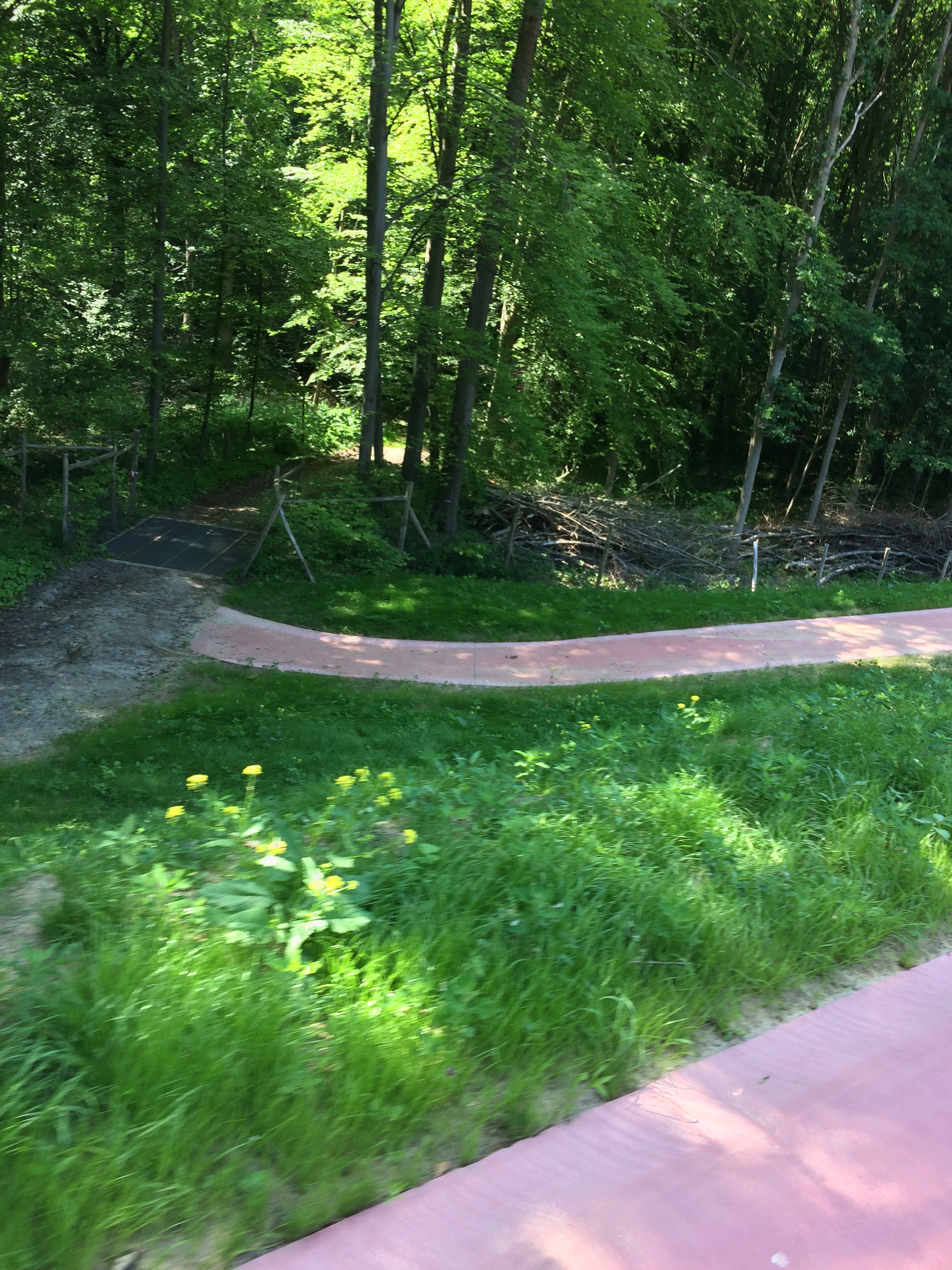 Revenons au côté ouest, où un chemin particulier du comte d’Arenberg devait être déplacé. En cet endroit, le talus n’était pas encore assez élevé pour permettre le passage en dessous. Vous pouvez d’ailleurs vérifier cela sur place en vous positionnant sur la piste cyclable. Même si ce petit tronçon de chemin commence à disparaître sous la nature, il demeure visible dans le paysage forestier, surtout en hiver. N’hésitez pas à vous y rendre, car ce chemin menant aux étangs de la Warande reste accessible aux piétons et aux cyclistes. Un nouvel accès a été créé à partir du talus, créant un zigzag notable. On aurait peut-être pu préférer revenir à l’ancien chemin, mais bon. Au moins les anciennes pavés fut gardées.