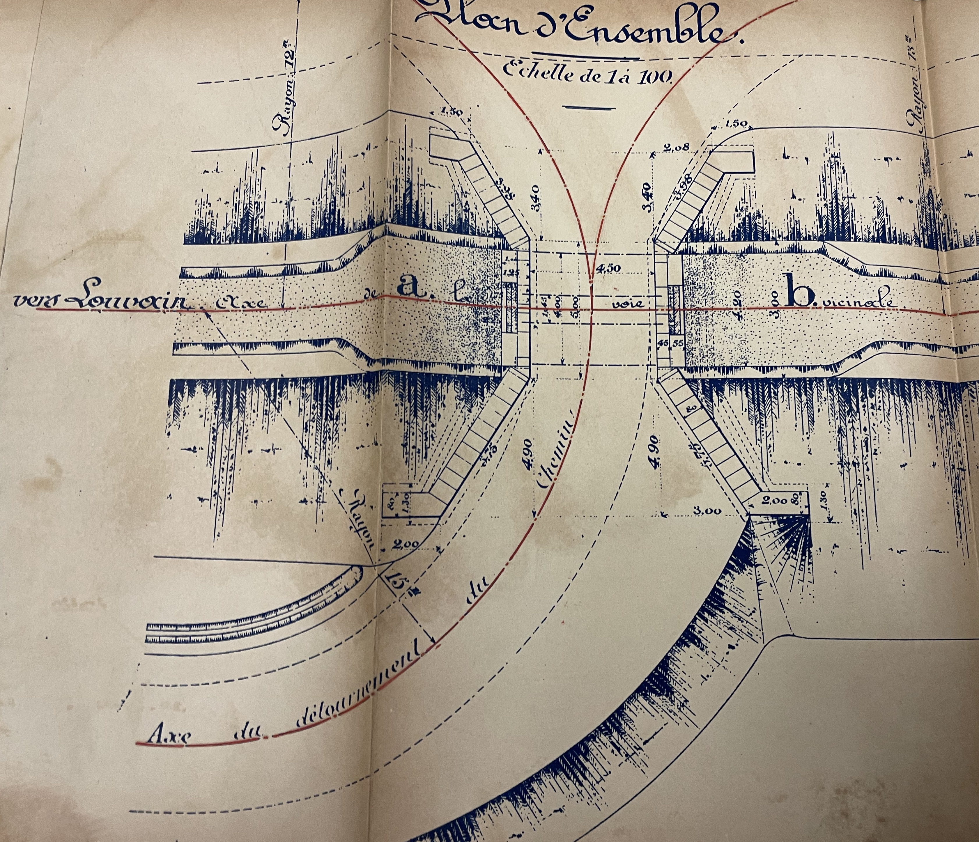 Voici donc la partie du plan détaillé qui m’a particulièrement enchanté et qui a suscité des rires parmi les bénévoles du musée. Les plans incluent même la description des rails adjacents au pont. Personnellement, je trouve cela à la fois beau et bien exécuté. Même dans un coin ‘oublié’ de la forêt, l’attention portée à l’aspect esthétique est évidente. Cela dit, nos ancêtres étaient également soucieux d’économies, et ce type de rails se retrouve dans plusieurs plans. Il y avait donc une certaine standardisation visant à réduire les coûts.