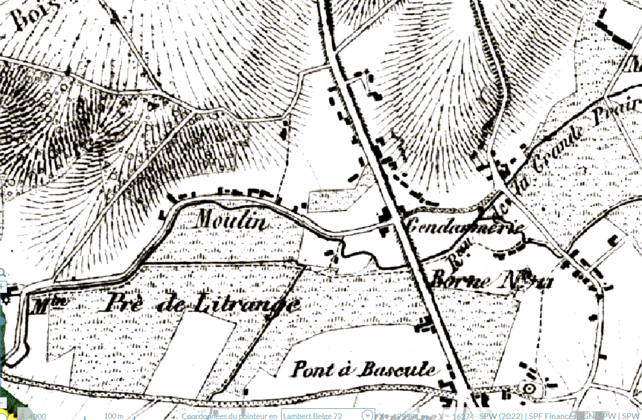 Non seulement il fallait construire un pont, mais la Néthen devait également être déplacée, perdant ainsi deux méandres. La rue des Claines devait elle aussi être légèrement déplacée. Je vais vous expliquer cela à travers plusieurs cartes et photos.