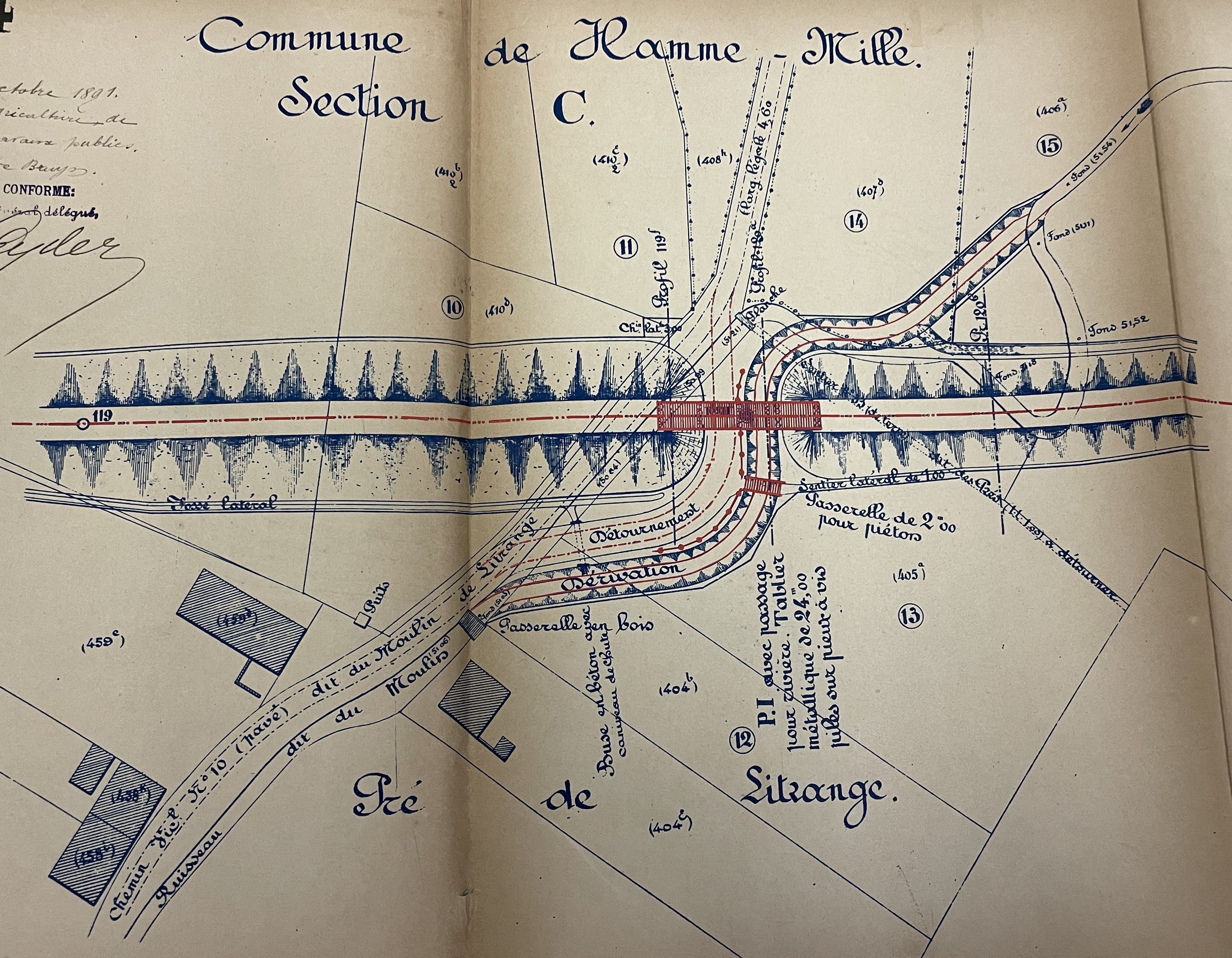 Comme promis la semaine dernière, afin de permettre l’accès à la rue actuelle des Claines (vers le Moulin de Litrange) ainsi qu’à la Néthen (également pour le moulin), il était nécessaire d’interrompre le talus avec un pont de plus de 24 mètres de long, 4,5 mètres de hauteur et presque 4 mètres de largeur. Ce pont, tout comme sa petite sœur dans la forêt, sera construit en fer.