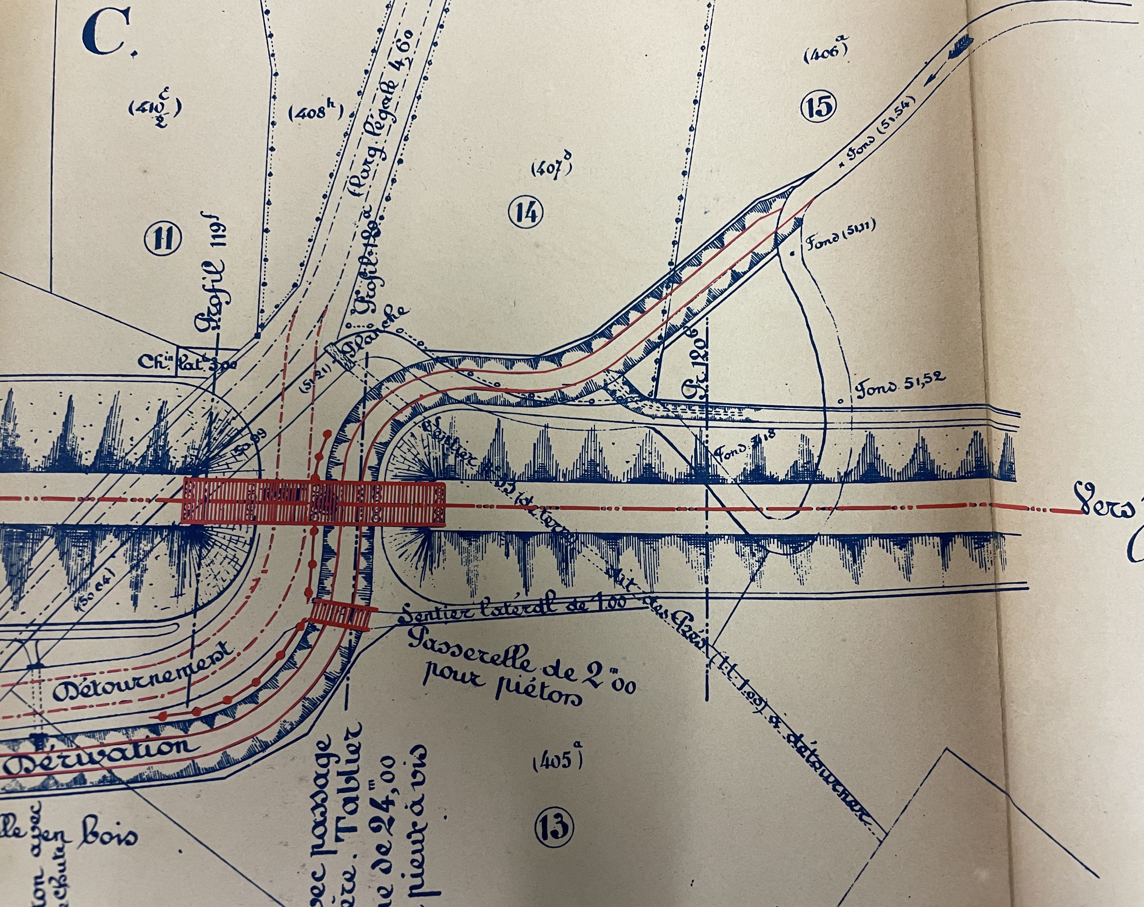 Sans aucun doute, cet aspect particulier a dû donner du fil à retordre à l’ingénieur de projet. En plus de tous les travaux déjà mentionnés, il y avait une buse en béton à installer (voir plan détaillé), et il était également nécessaire de construire une passerelle pour piétons. Cette buse existe encore (en plastique il me semble), même si le fossé le long du talus en descendant n’est plus présent. Nous reviendrons plus tard sur le petit pont pour piétons.