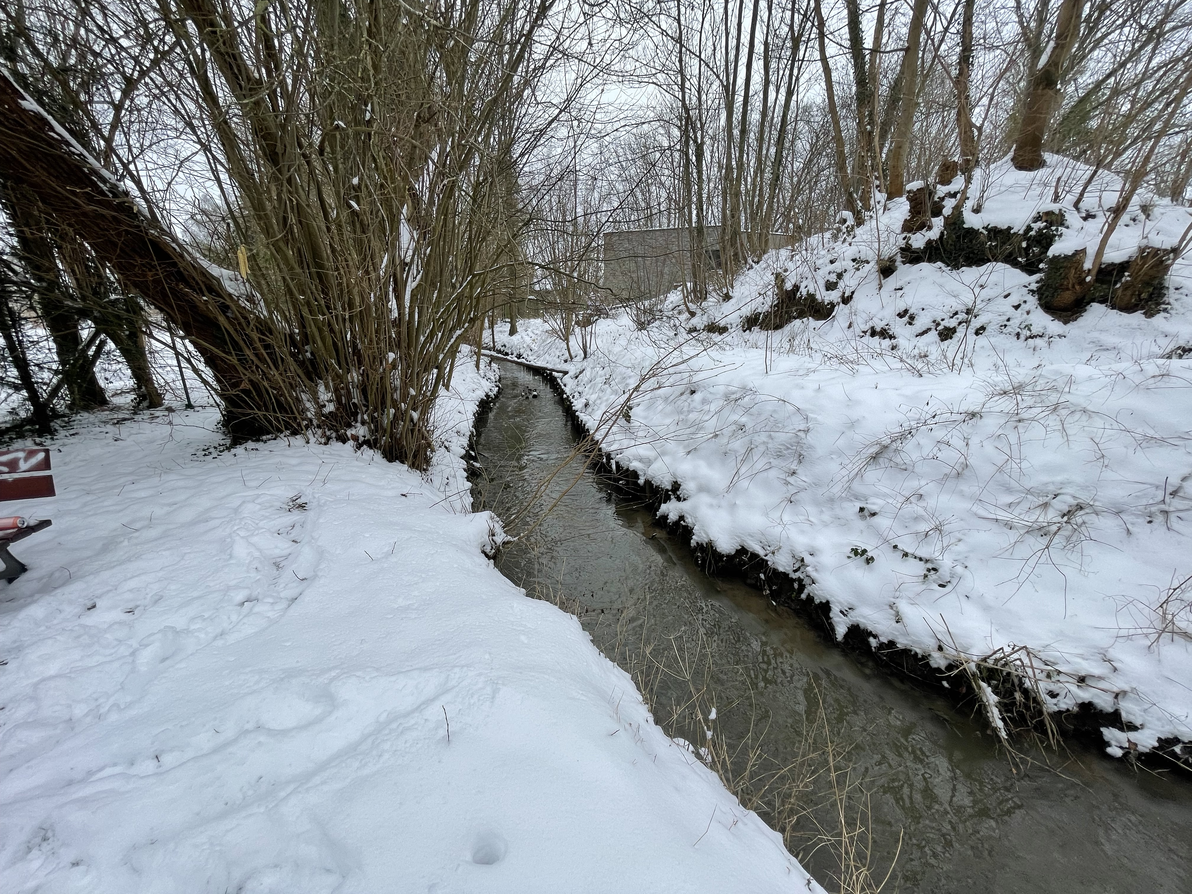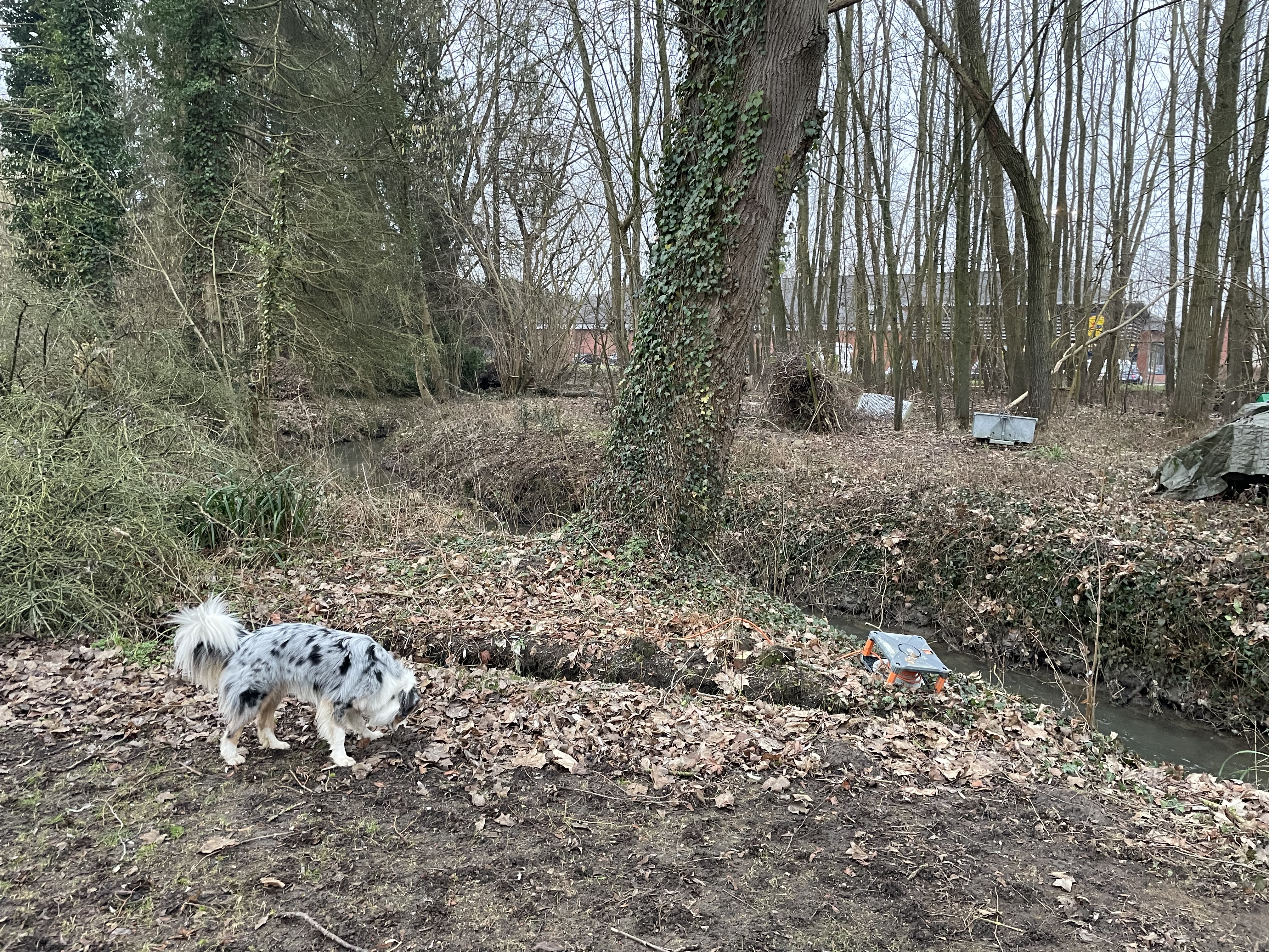Vu prise en regardant vers le Sud (Lidl), là ou la Néthen faisait encore un méandre en plus (plus ou moins juste derrière l’arbre). Je tiens à remercier Philippe et Inge de Milloptics (et leur chien Peppa) qui ont aimable donné accès à leur propriété pour prendre cette photo