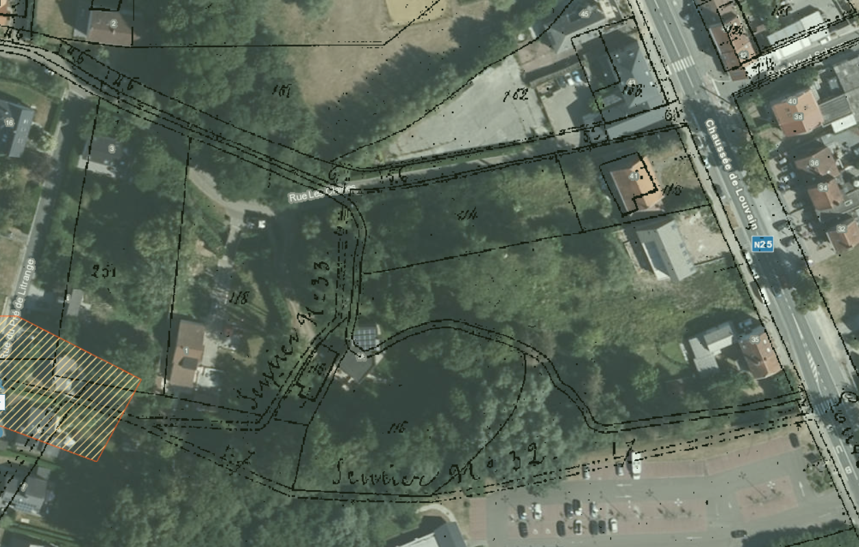Vu aerien actuel avec carte cadastrale ancienne superposée. Le talud (boisé) se trouve donc sur l’ancien lit de la Néthen