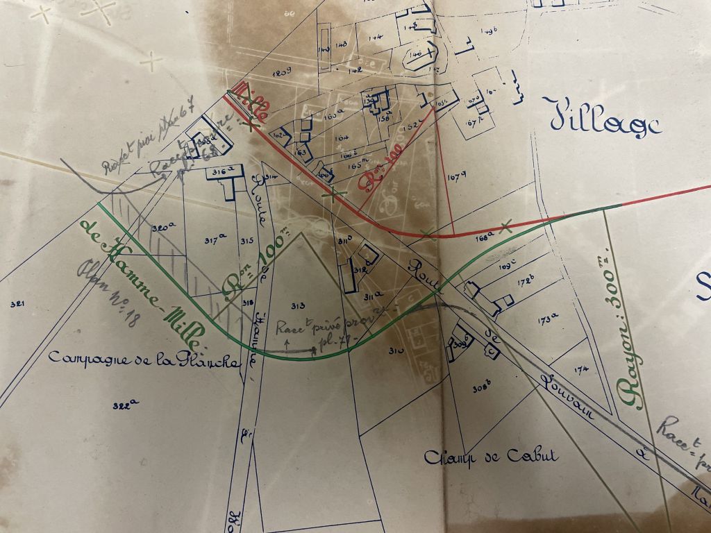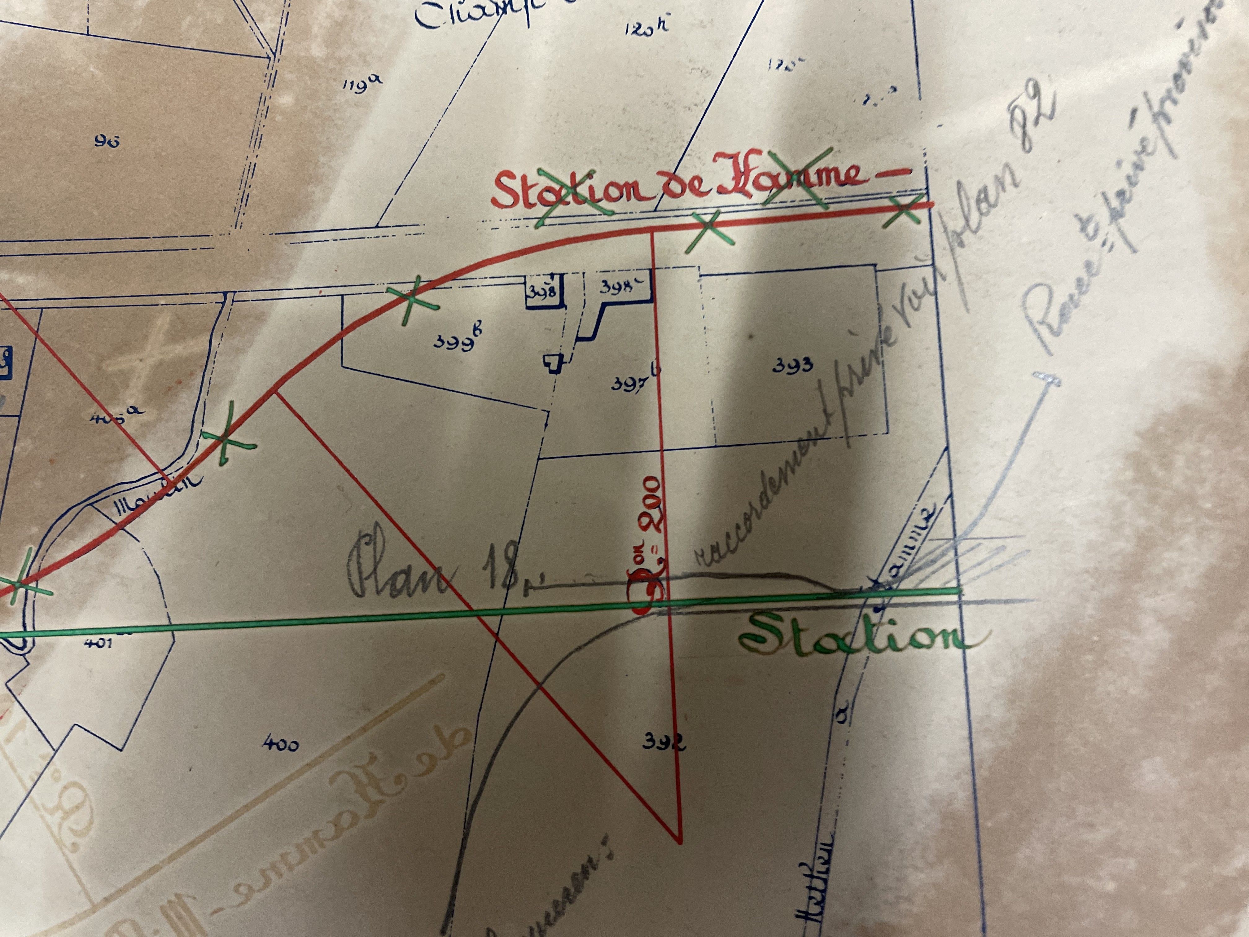 Comme le montre le plan, le trajet devrait donc suivre le cours du Nethen (probablement en le déviant comme cela a été fait à hauteur de la Rue des Claines), pour ensuite passer par l’actuel parking du Lidl et croiser la chaussée. Le champ Tamet permettait, tout comme à la gare de Blanden, de développer une gare le long de la chaussée. Il y avait donc peu d’expropriations à faire, mais probablement plus sur la courbe au niveau du Lidl et plus loin.