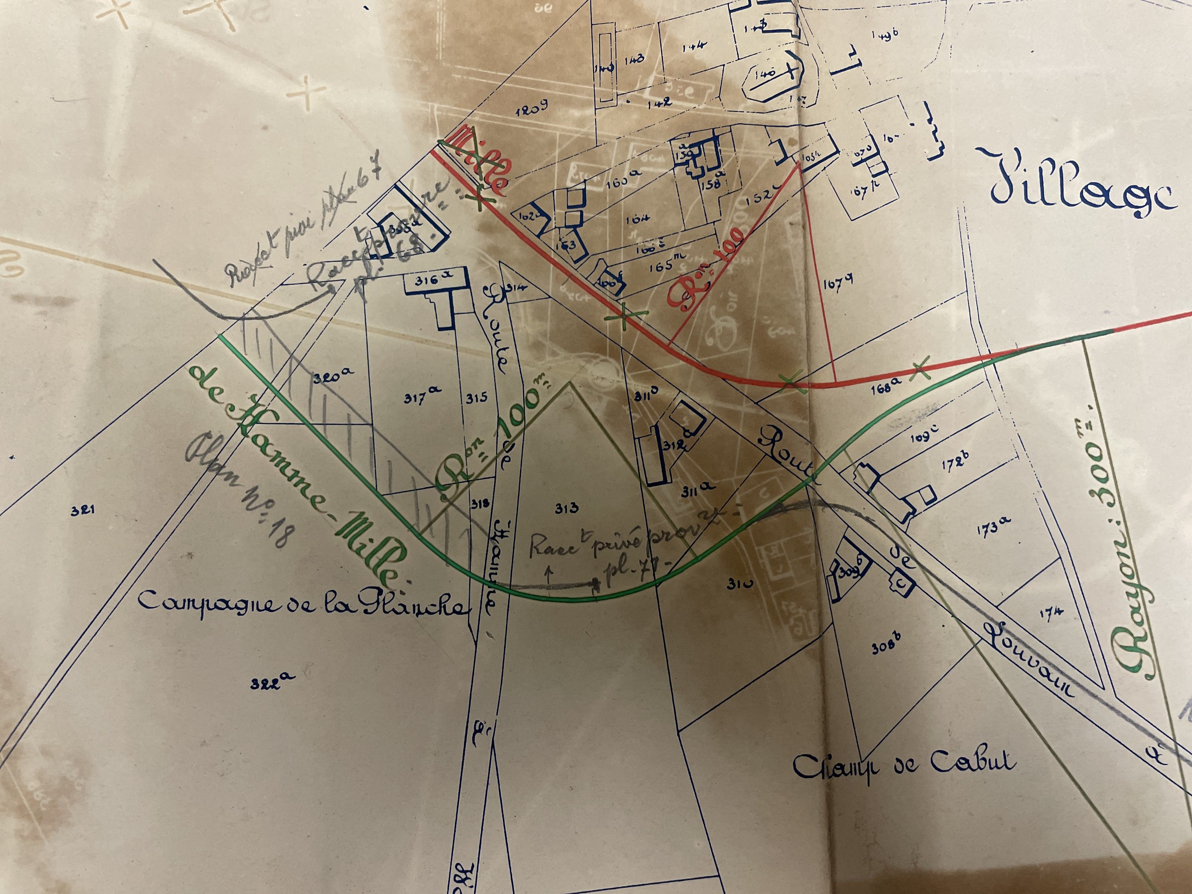 Deux points importants méritent d’être notés à propos de ce document. Tout d’abord, on peut remarquer sur le détail une ligne d’aide tracée au crayon pour l’inscription en encre verte de « Hamme-Mille ». Cela indique vraisemblablement que c’était l’esquisse originale, ajustée suite aux modifications du trajet. Deuxièmement, il y a de nombreuses lignes tracées au crayon sur ce document, parfois même rayés par la suite. Cela suggère que ce document était un inventaire dynamique d’adaptations et de raccordements « privés ». Nous reviendrons sur ces raccordements ultérieurement.