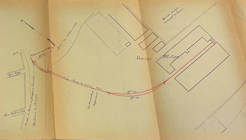Le premier concerne un raccordement provisoire et non daté vers les usines Philips à Heverlee, sur un ancien champ de manœuvres de l’armée. La carte ne comporte pas de date précise, mais nous savons que ces deux grands bâtiments ont été construits entre 1941 et 1942. Étant donné la qualité inférieure du papier et surtout l’absence de plan détaillé normalement présent (peut-être en raison de ressources limitées?), je pense que ce plan peux dater de l’occupation allemande. Pour information, ces deux bâtiments existent toujours et marquent toujours le paysage urbain de Leuven, même si l’enseigne « Philips » a disparu du batiment même.