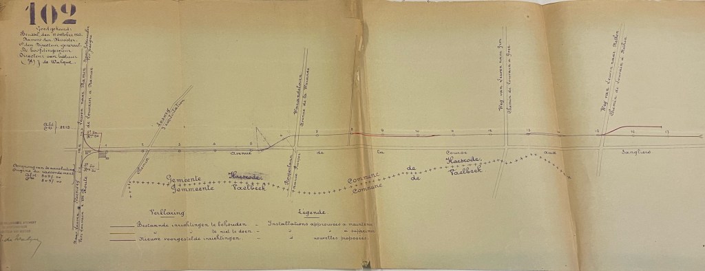 Pour ceux qui ne se situent pas immédiatement, nous sommes proches de l’ancienne brasserie « La Chasse » (n° 173a sur la carte cadastrale), aujourd’hui connue sous le nom de Brasserie 500. Entre-temps, la E40 a été construite à cet endroit. Le couvent « De Jacht » sera construit à proximité dans quelques années, aussi avec l’aide du tram.