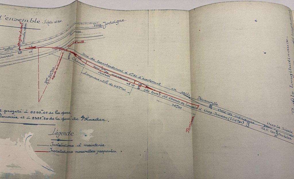En 1935, il y a même eu un élargissement, avec l’ajout de voies (d’attente?) supplémentaires. Il est évident qu’il y avait beaucoup de bois munitions à transporter. De plus, un aiguillage a été ajouté en direction de Hamme-Mille. Il y avait donc une demande d’approvisionnement de ce côté-là – Hamme-Mille ou plus loin, voire même Jodoigne ou Tirlemont.