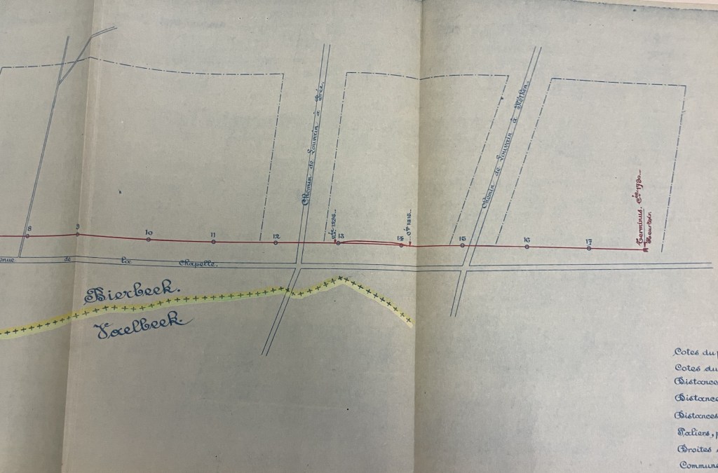 Un peu plus loin, dans la forêt de Meerdael, un raccordement plus élaboré (long de 1,5 km !) a été planifié en 1926. Nous nous trouvons ici à la lisière nord de la forêt. Attention, l’intitulé « Bierbeek » peut induire en erreur (je me suis également trompé initialement…). Il s’agit de l’ancienne commune de Bierbeek, qui a été scindée en 1928 comme expliqué dans cet article sur le site officiel de Bierbeek en Bierbeek et Haasrode. Mais ici, tout est encore Bierbeek !
