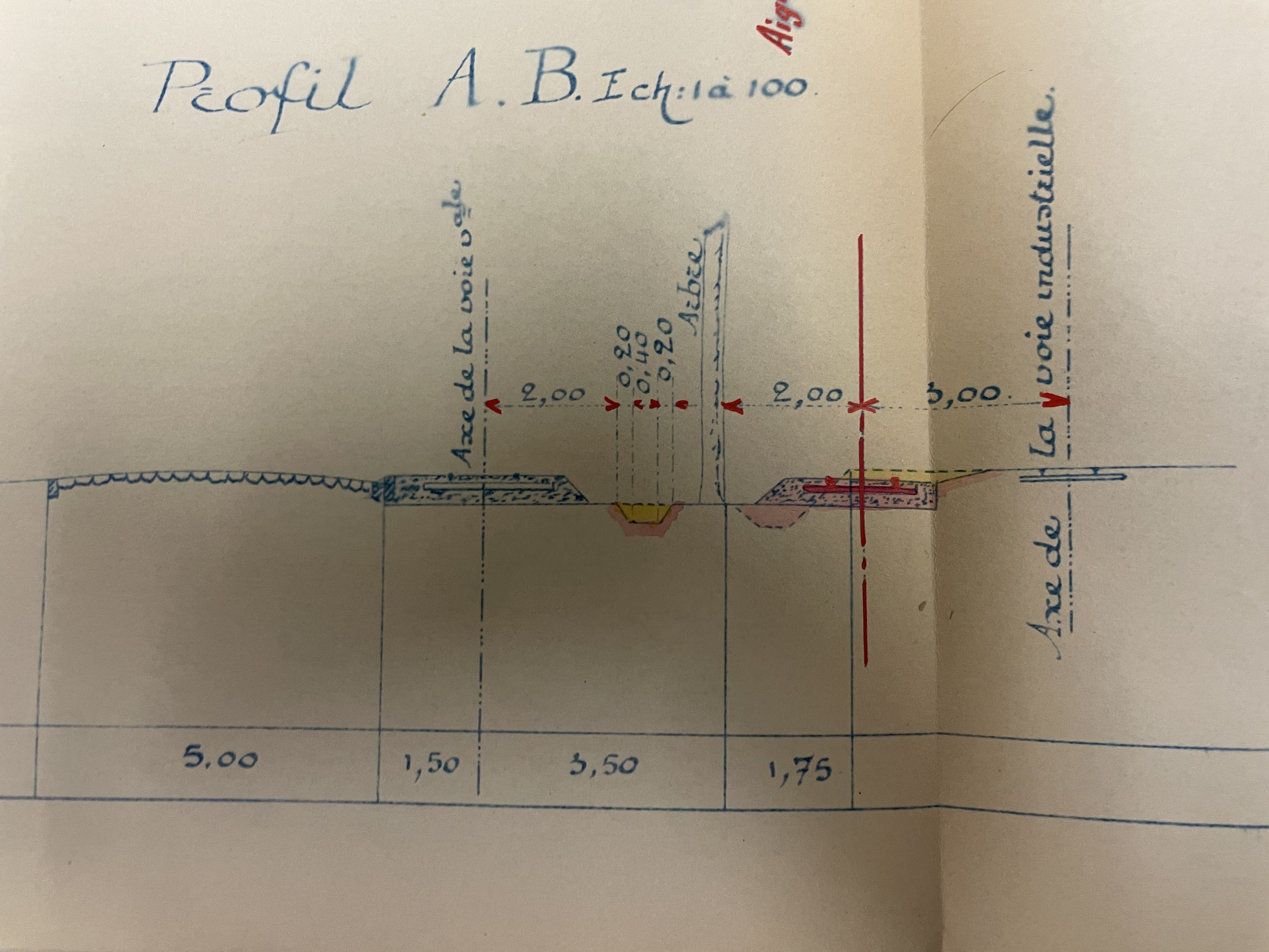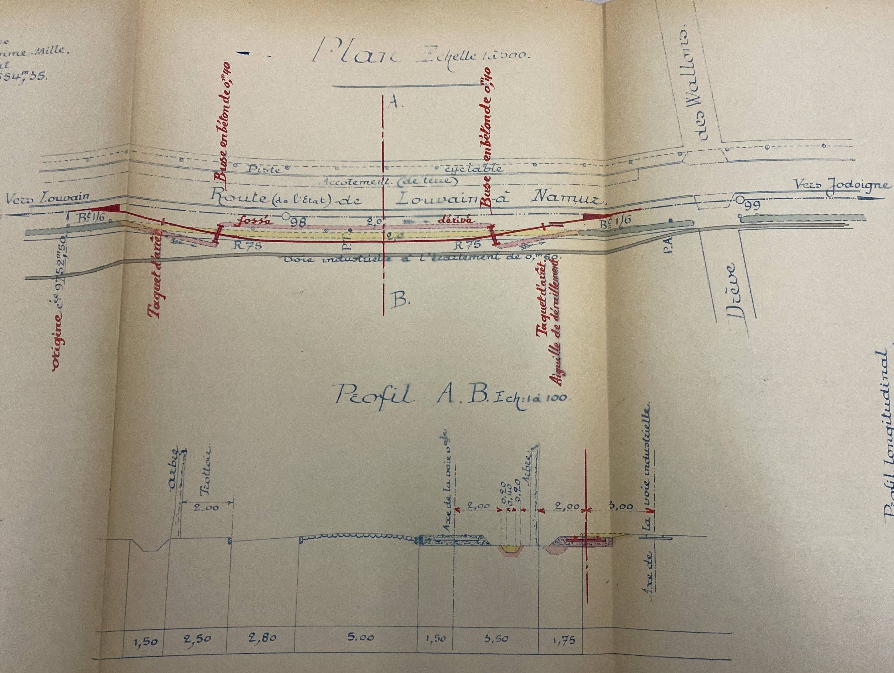 Le détail et le profil sont intéressants car cela montre aussi la situation existante lors de la construction. Tout d’abord, remarquez « piste cyclable » ! Déjà à cette époque… une piste cyclable d’une largeur de 2m et bien eloignée de la chaussée pavée! Ce n’est donc pas une invention ou tendance recente … cela existait déjà il y a plus de 100 ans ! La piste cyclable actuelle très utilisée se trouve maintenant de l’autre côté, sur l’ancien lit du tram. Le plan détaillé montre également que cette piste était bordée d’arbres. Ayant moi-même encore emprunté cette ancienne piste cyclable à vélo, je comprends pourquoi elle était si mauvaise. Car même si cette rangée d’arbres avait disparu, les racines étaient toujours là…