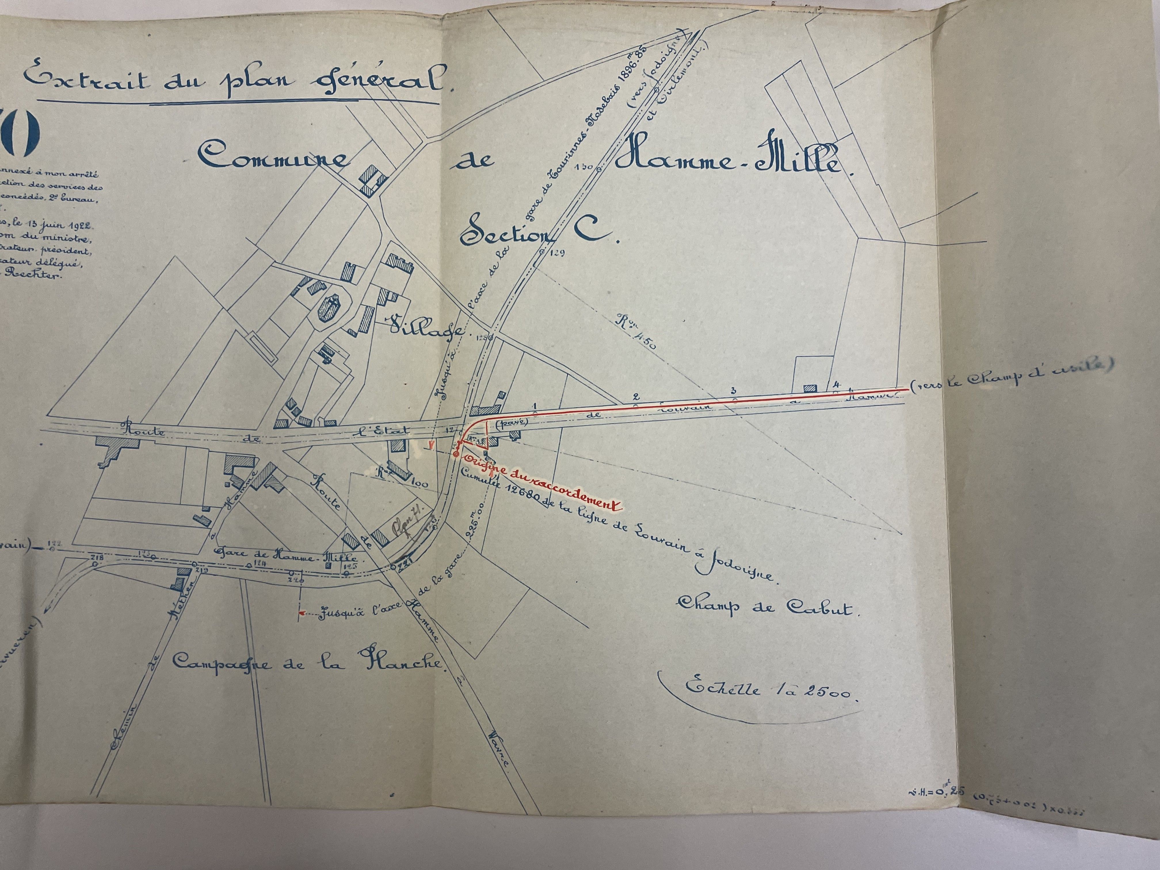 C’est en avril 1922 qu’un plan fut approuvé pour un raccordement privé et provisoire à Hamme-Mille. Le tracé, indiqué en rouge, serait donc temporaire (elle ne se retrouve plus sur la photo aérienne de 1948). Au moment où le tramway s’apprêtait à traverser la chaussée de Namur (près de l’actuelle École Caritas), un aiguillage devrait être installé à 225 mètres de « l’axe de la gare ». Une ligne temporaire devrait donc longer cette chaussée. On remarque également un indicateur de distance (1 pour 100 mètres, 2 pour 200 mètres, etc.), sans doute pour permettre de facturer le coût de l’installation et de son utilisation