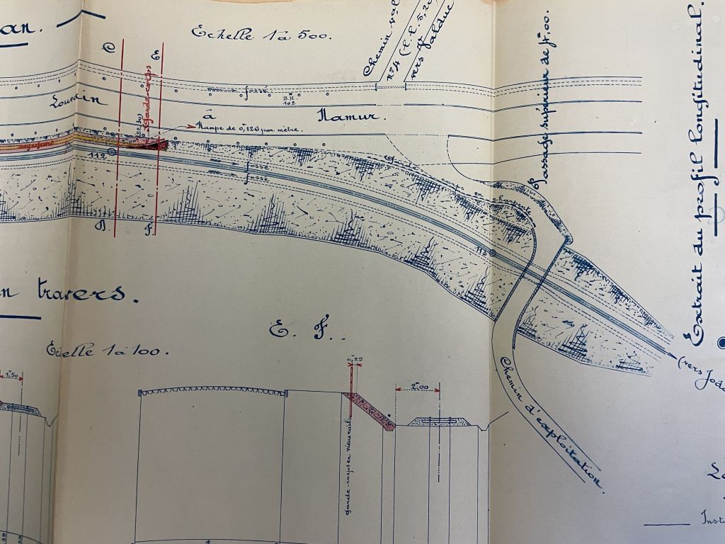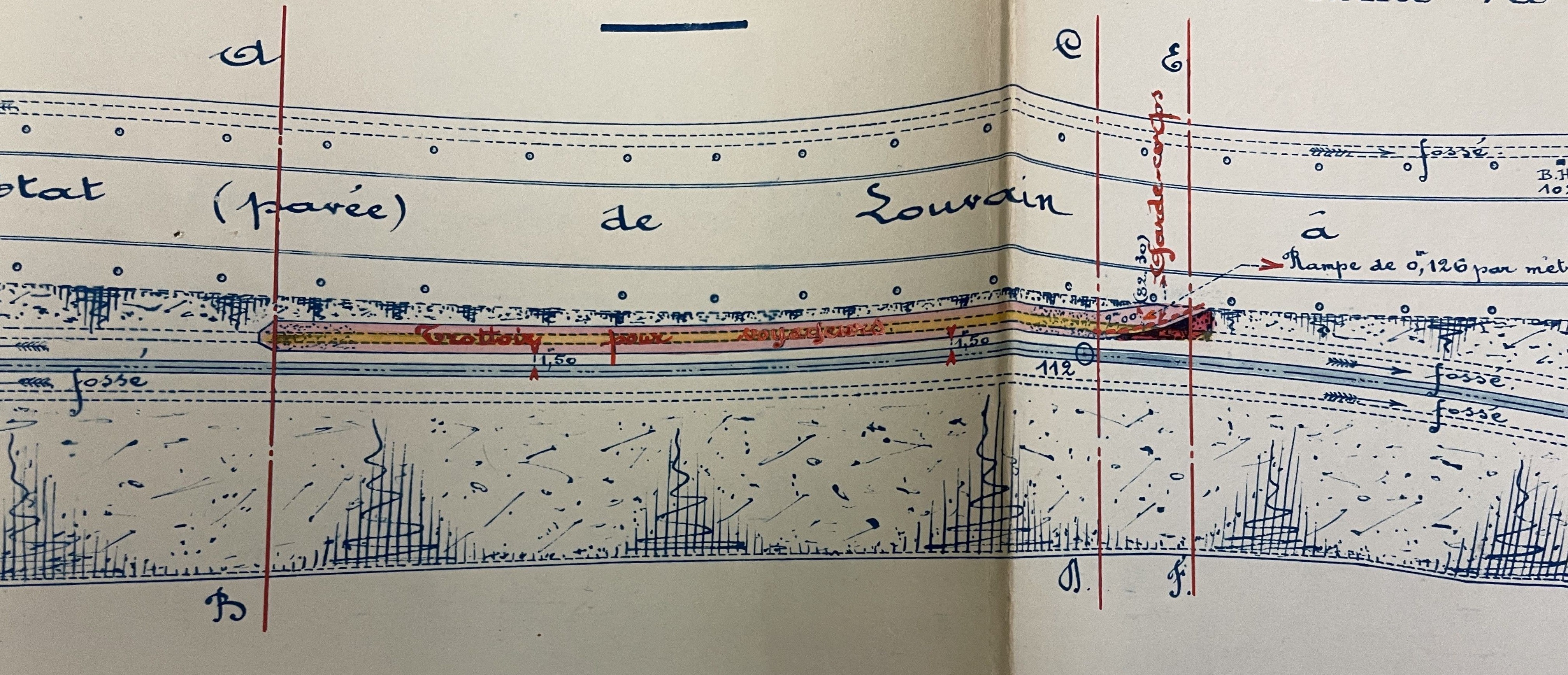 […] Ensuite, cette ligne rejoint le chemin vicinal 25 (attention, le plan est décalé sur l’illustration et donc pas exactement au bon endroit), que l’on connaît mieux comme étant actuellement la prolongation de la rue des Combattants. Le tram se trouvait donc plus ou moins à l’emplacement de l’actuelle piste cyclable, comparable avec celle qui part de Valduc. […]