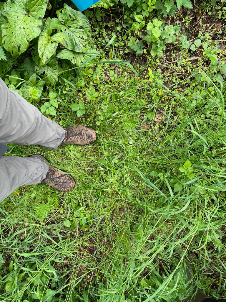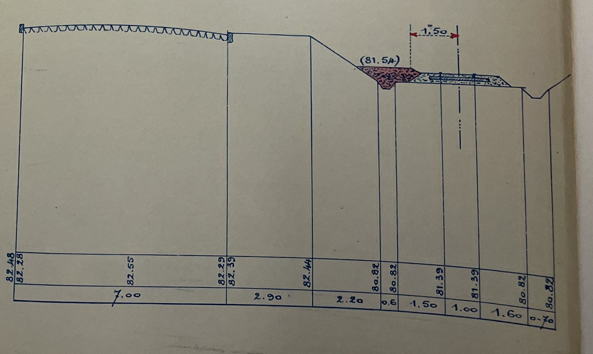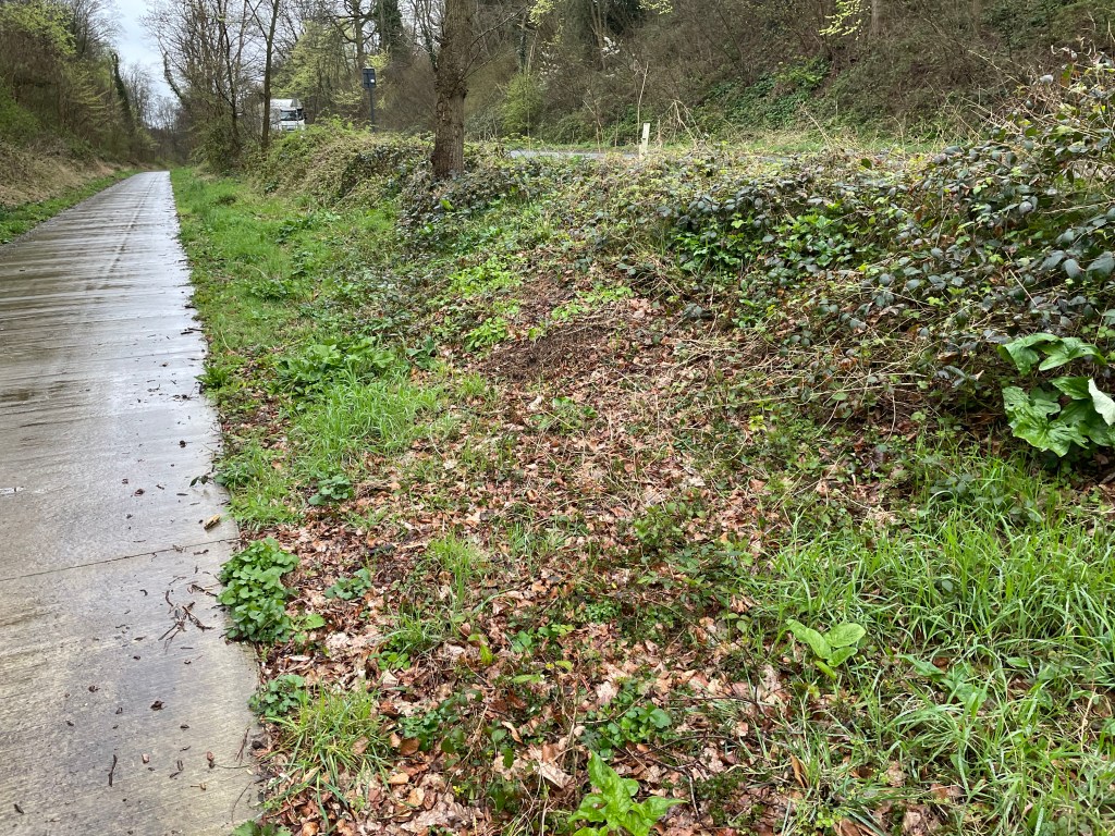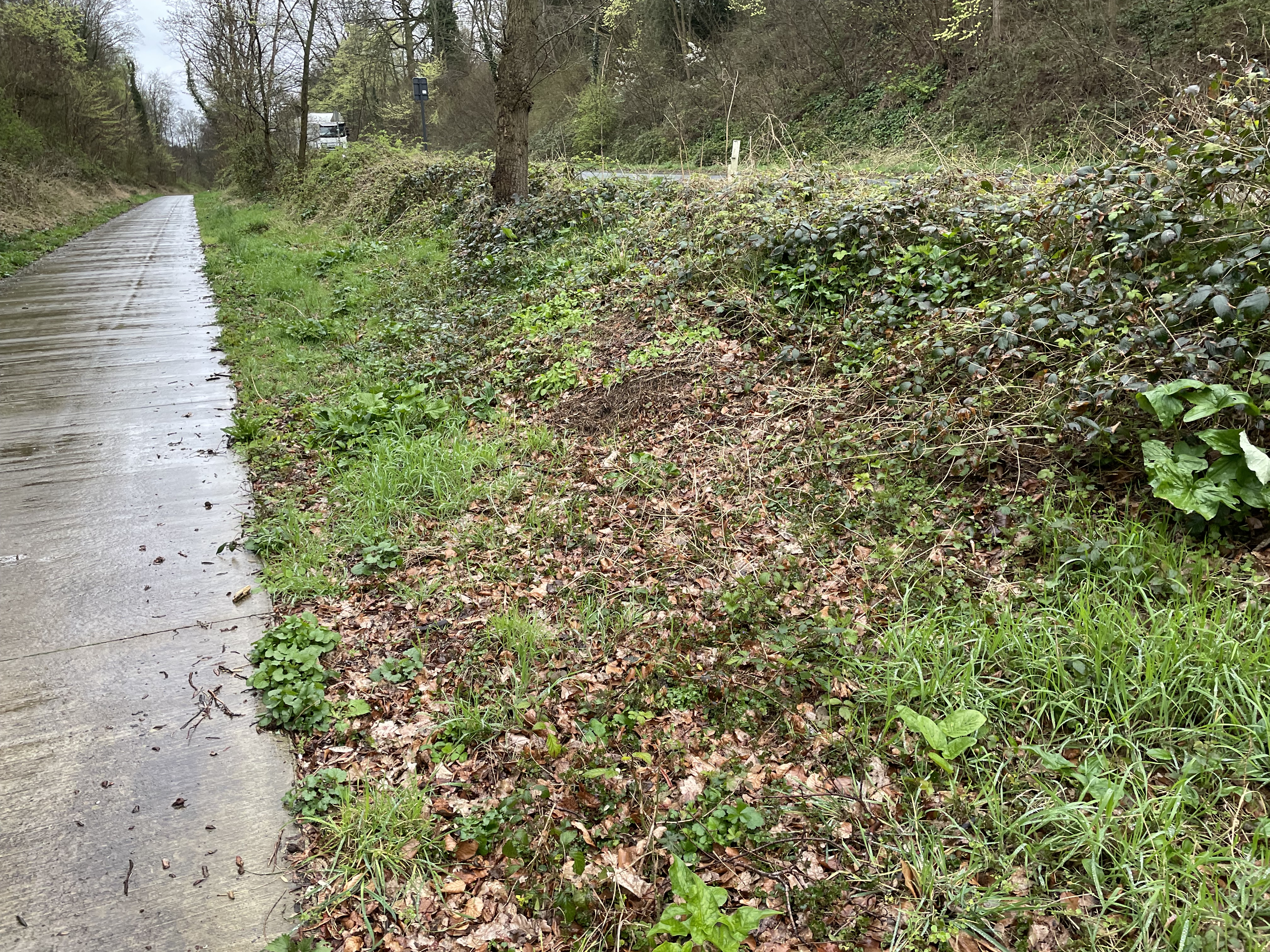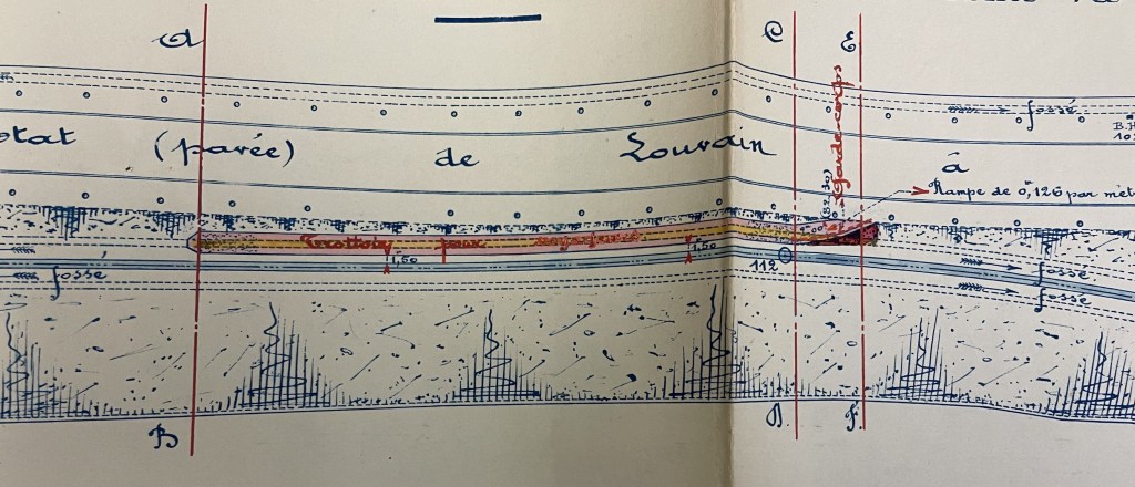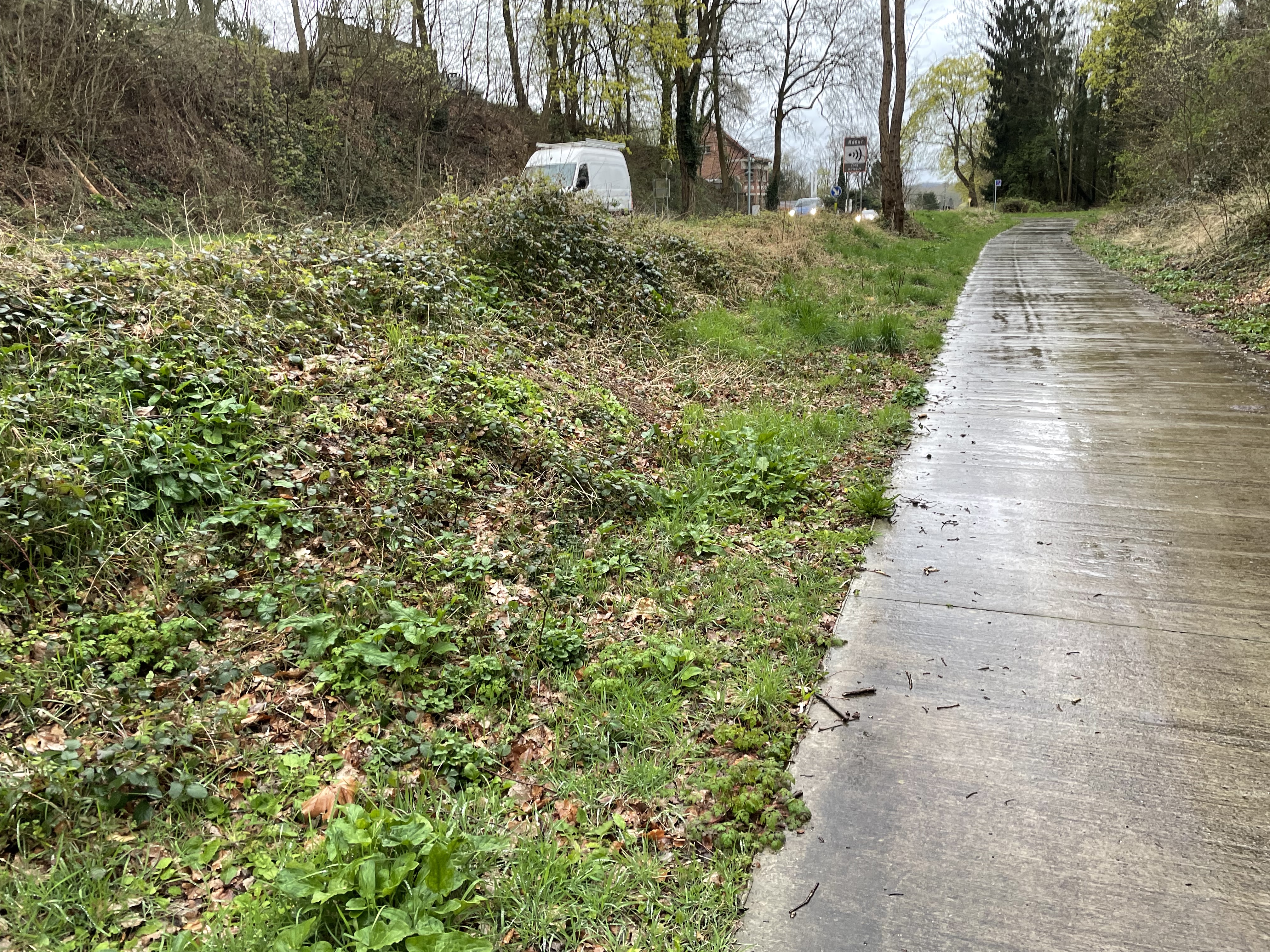 Je me suis également demandé s’il était encore possible de retrouver quelque chose de cette ancienne halte de tram. Malheureusement, il y a très peu de vestiges que l’on peut identifier. Je me souviens être passé à cet endroit avant et pendant la construction de la (belle !) piste cyclable. Même si je n’étais pas au courant à ce moment-là de l’existence de la halte, je n’ai rien remarqué de spécifique. Actuellement, il y a encore moins à voir. En tapotant avec les pieds, on peut spéculer que la halte se trouvait plus ou moins à cet endroit sur la photo prise et que la petite rampe d’accès se trouve sur la deuxième photo… On sent qu’il y a un peu plus de terre à cet endroit. Et c’est bien l’emplacement indiqué sur le plan… Il est intéressant de se dire qu’on pouvait y prendre le tram vers Leuven, Jodoigne ou Tienen.
