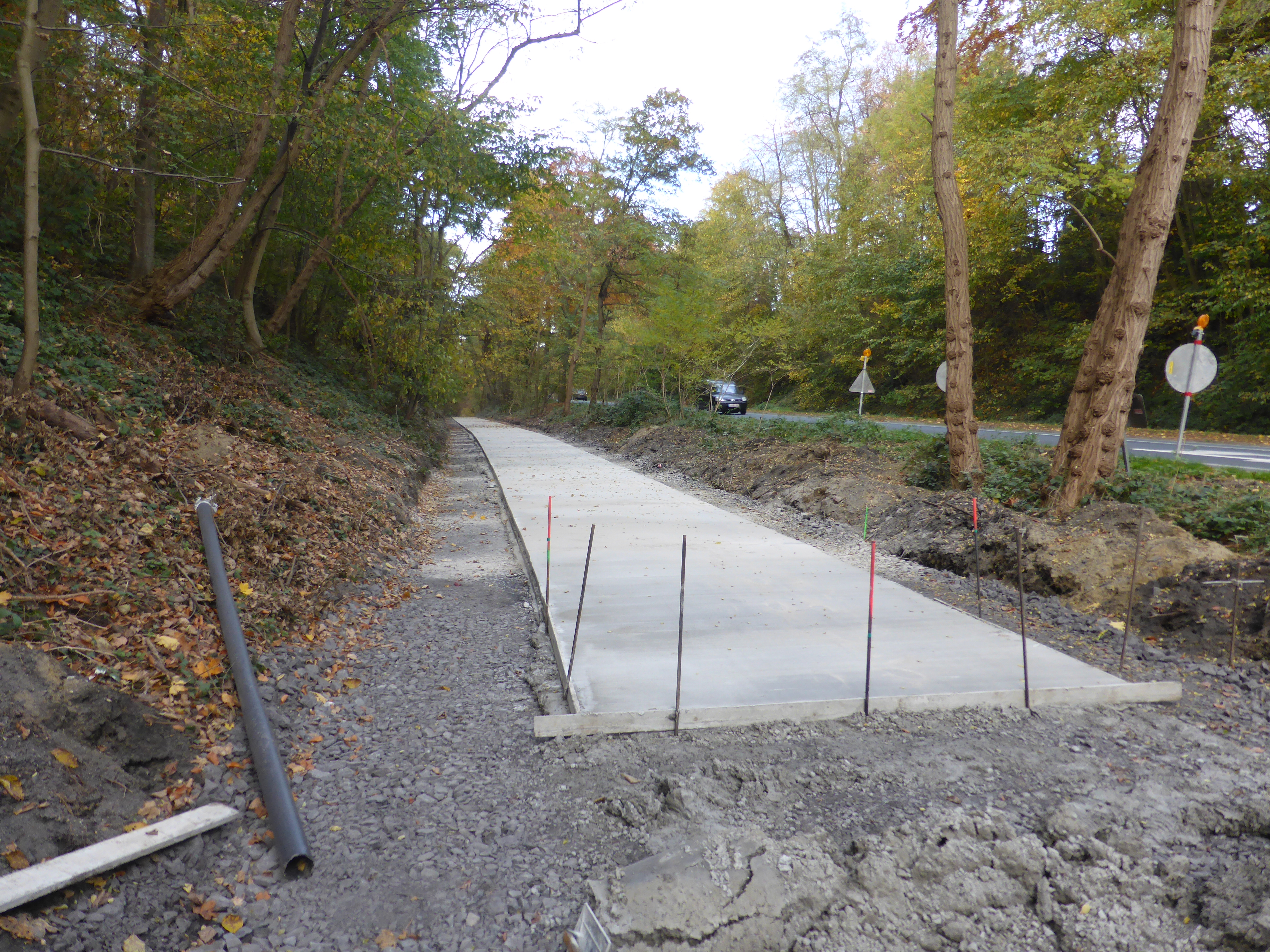Ceux qui connaissent la piste cyclable actuelle savent que le tracé du tram (donc de la piste cyclable) est situé plus bas que la chaussée. Il fallait donc construire un « trottoir » de 75 mètres de long et 2 mètres de large pour permettre aux piétons d’attendre le tram. Un fossé a même été remblayé, et je ne vois pas de déviations (comme celles que l’on a vues au pont des Claines ou dans le bois, à l’arret précédent).