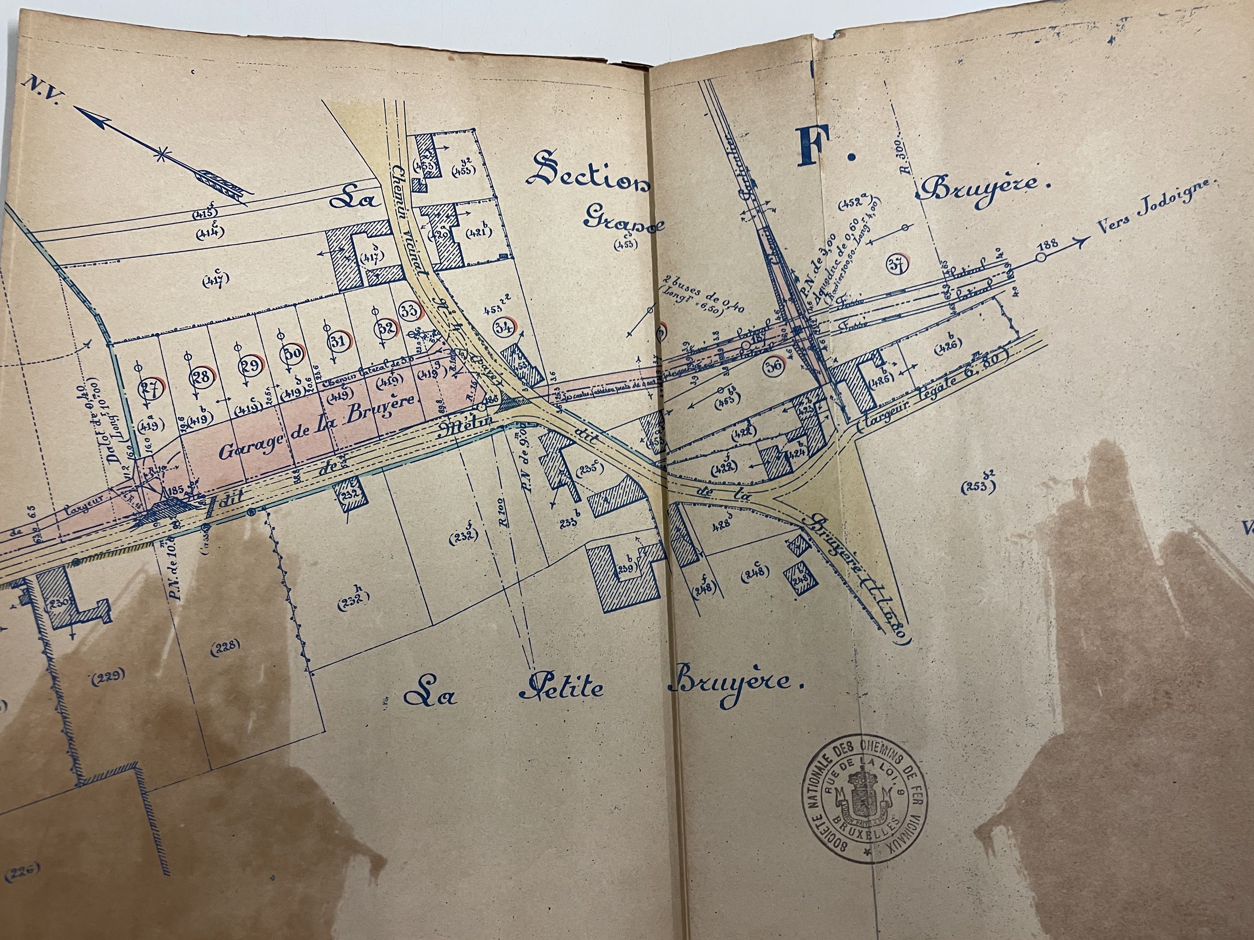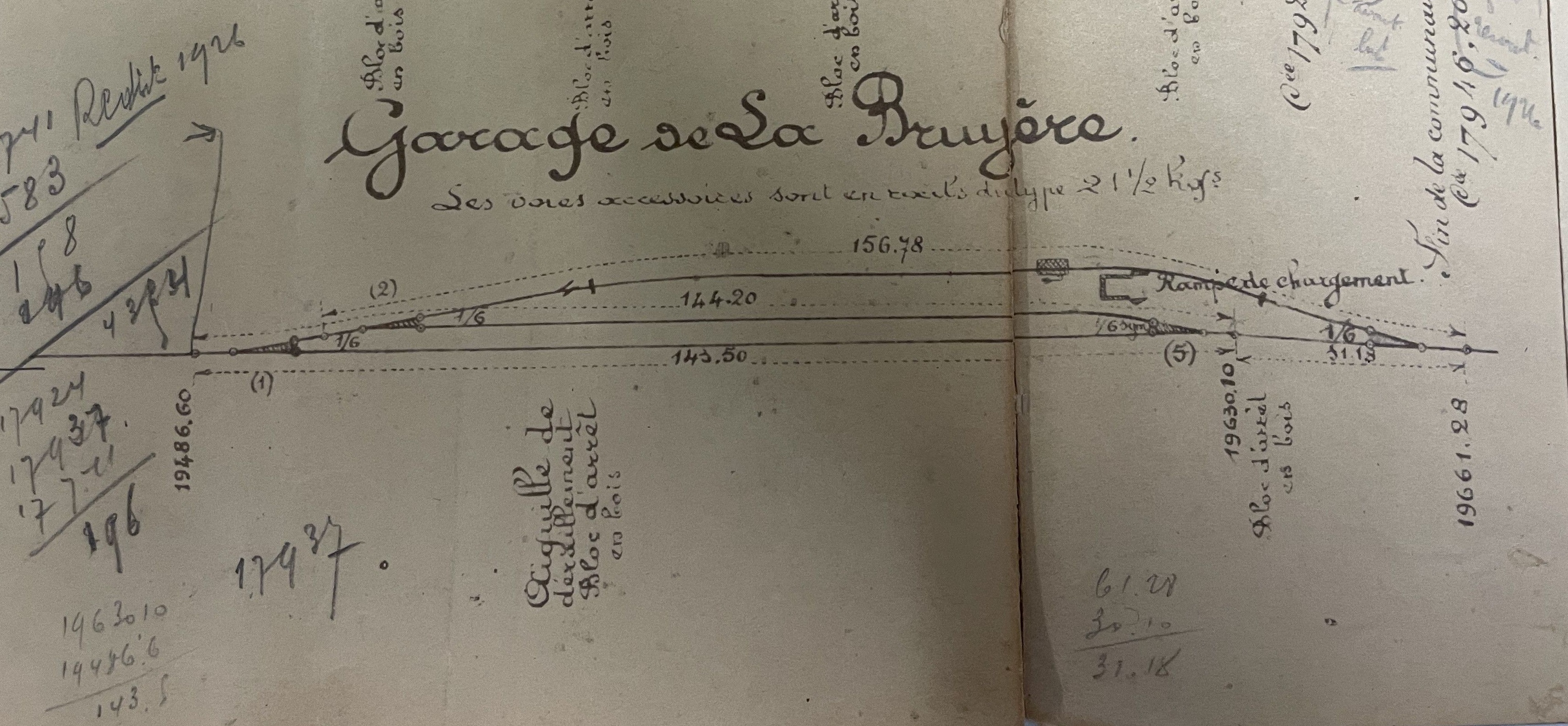 Tout d’abord, parlons du « Garage de La Bruyère » – le nom que cette gare avait reçu depuis le début. Voici le plan initial des voies, qui était clairement aussi un document de travail pour quelqu’un, car des calculs au crayon y sont visibles…