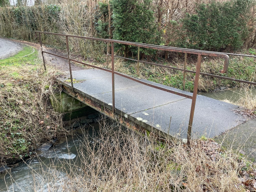 Sur le plan ci-dessus, vous pouvez également observer l’ancien lit de la Néthen à gauche. À titre d’illustration, voici le talus actuel, où cet ancien lit n’est plus du tout visible. Veuillez noter que le talus est une propriété privée, merci de respecter.